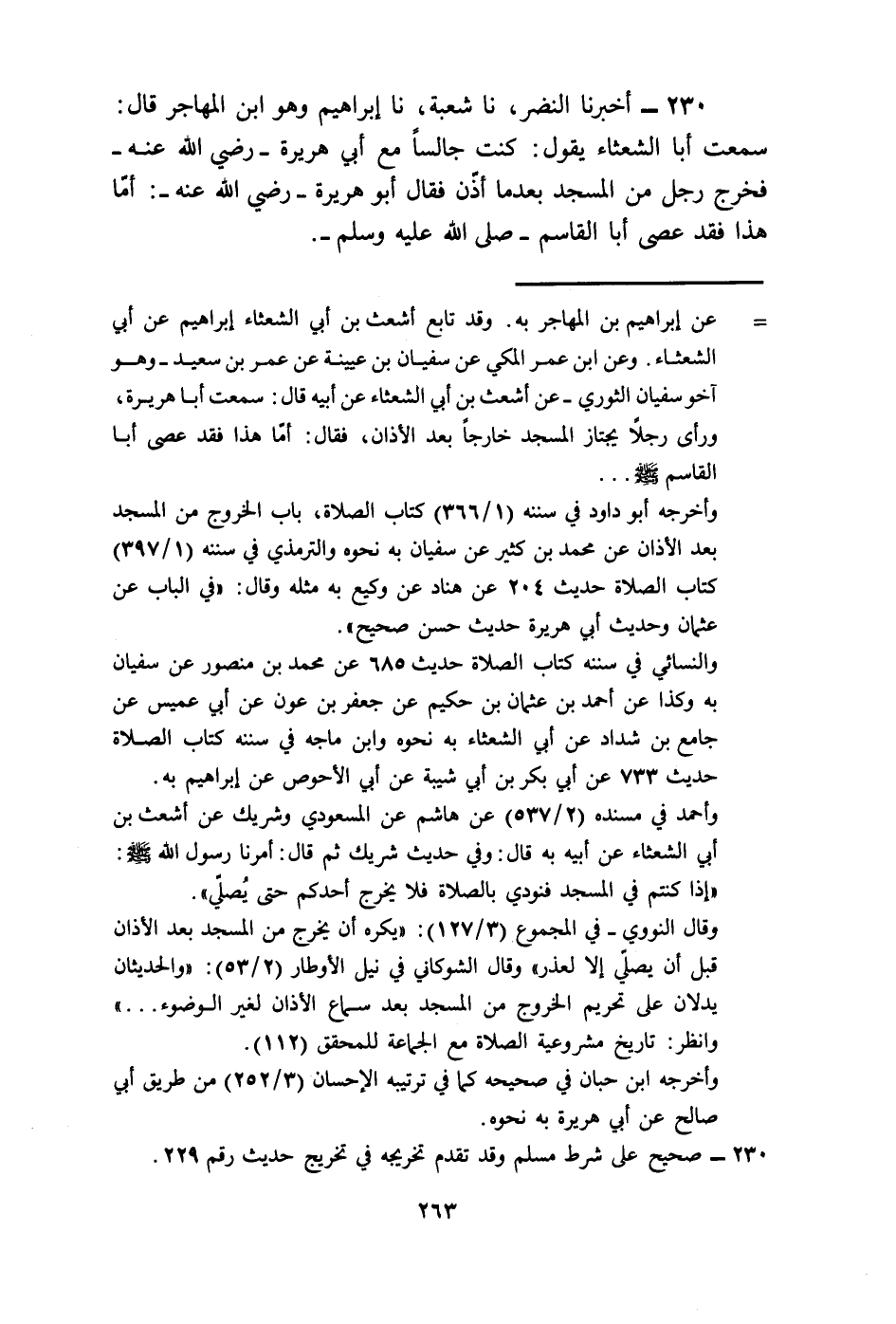 230 - أَخْبَرَنَا النَّضْرُ، نا شُعْبَةُ، نا إِبْرَاهِيمُ وَهُوَ ابْنُ الْمُهَاجِرِ قَالَ: سَمِعْتُ أَبَا الشَّعْثَاءِ، يَقُولُ: كُنْتُ جَالِسًا مَعَ أَبِي هُرَيْرَةَ رَضِيَ اللَّهُ عَنْهُ فَخَرَجَ رَجُلٌ مِنَ الْمَسْجِدِ بَعْدَمَا أُذِّنَ، فَقَالَ أَبُو هُرَيْرَةَ رَضِيَ اللَّهُ عَنْهُ: أَمَّا هَذَا فَقَدْ §عَصَى أَبَا الْقَاسِمِ صَلَّى اللهُ عَلَيْهِ وَسَلَّمَ
