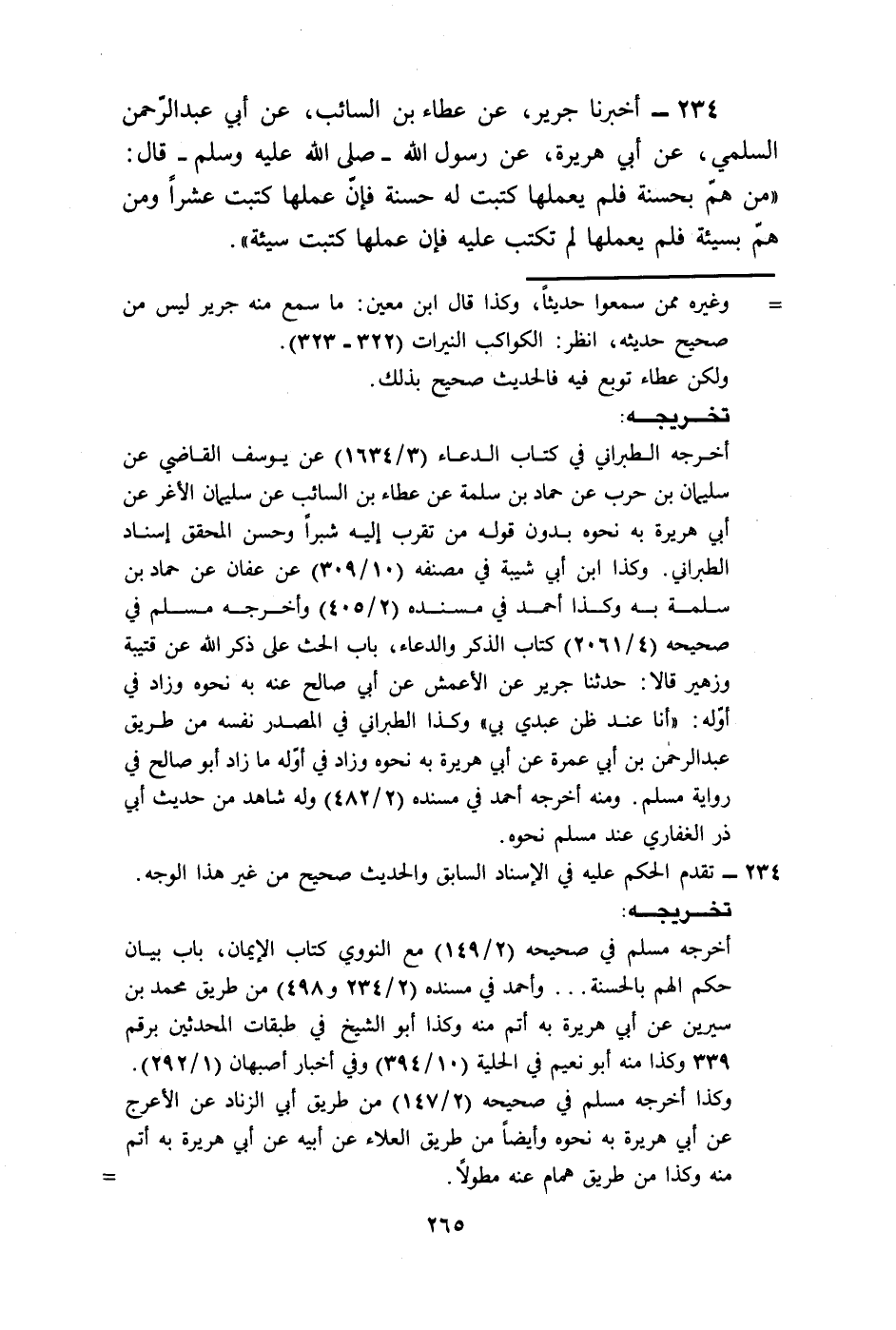 234 - أَخْبَرَنَا جَرِيرٌ، عَنْ عَطَاءِ بْنِ السَّائِبِ، عَنْ أَبِي عَبْدِ الرَّحْمَنِ السُّلَمِيِّ، عَنْ أَبِي هُرَيْرَةَ، عَنْ رَسُولِ اللَّهِ صَلَّى اللهُ عَلَيْهِ وَسَلَّمَ قَالَ: «§مَنْ هَمَّ بِحَسَنَةٍ فَلَمْ يَعْمَلْهَا كُتِبَتْ لَهُ حَسَنَةً فَإِنْ عَمِلَهَا كُتِبَتْ عَشْرًا، وَمَنْ هَمَّ بِسَيِّئَةٍ فَلَمْ يَعْمَلْهَا لَمْ تُكْتَبْ عَلَيْهِ، فَإِنْ عَمِلَهَا كُتِبَتْ سَيِّئَةً» .