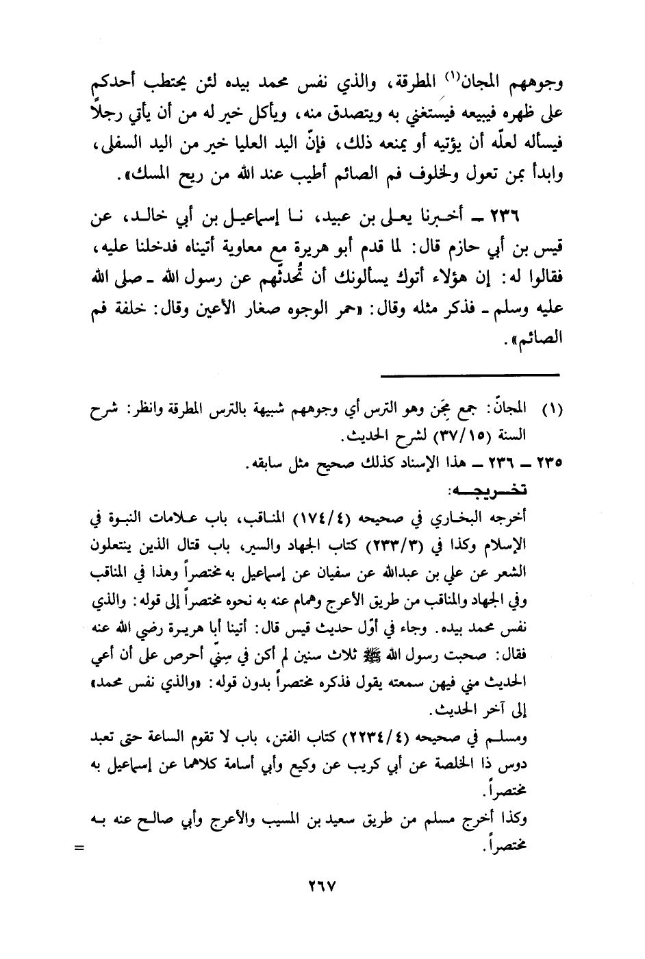 236- أَخْبَرَنَا يَعْلَى بْنُ عُبَيْدٍ ، حَدَّثَنَا إِسْمَاعِيلُ بْنُ أَبِي خَالِدٍ ، عَنْ قَيْسِ بْنِ أَبِي حَازِمٍ ، قَالَ : لَمَّا قَدِمَ أَبُو هُرَيْرَةَ مَعَ مُعَاوِيَةَ ، أَتَيْنَاهُ فَدَخَلْنَا عَلَيْهِ ، فَقَالُوا لَهُ : إِنَّ هَؤُلاَءِ أَتَوْكَ يَسْأَلُونَكَ أَنْ تُحَدِّثَهُمْ عَنْ رَسُولِ اللَّهِ صَلَّى اللَّهُ عَلَيْهِ وَسَلَّمَ ، فَذَكَرَ مِثْلَهُ ، وَقَالَ : حُمْرُ الْوُجُوهِ صِغَارُ الأَعْيُنِ ، وَقَالَ : خِلْفَةُ فَمِ الصَّائِمِ.