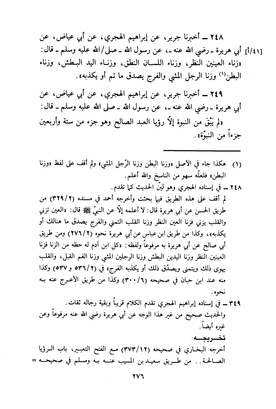 248 - أَخْبَرَنَا جَرِيرٌ، عَنْ إِبْرَاهِيمَ الْهَجَرِيِّ، عَنْ أَبِي عِيَاضٍ، عَنْ أَبِي هُرَيْرَةَ رَضِيَ اللَّهُ عَنْهُ، عَنْ رَسُولِ اللَّهِ صَلَّى اللهُ عَلَيْهِ وَسَلَّمَ قَالَ: «§زِنَاءُ الْعَيْنَيْنِ النَّظَرُ، وَزِنَاءُ اللِّسَانِ النُّطْقُ، وَزِنَاءُ الْيَدِ الْبَطْشُ، وَزِنَاءُ الْبَطْنِ، وَزِنَا الرِّجْلِ الْمَشْيُ، وَالْفَرْجُ يُصَدِّقُ مَا تَمَّ أَوْ يُكَذِّبُهُ» .