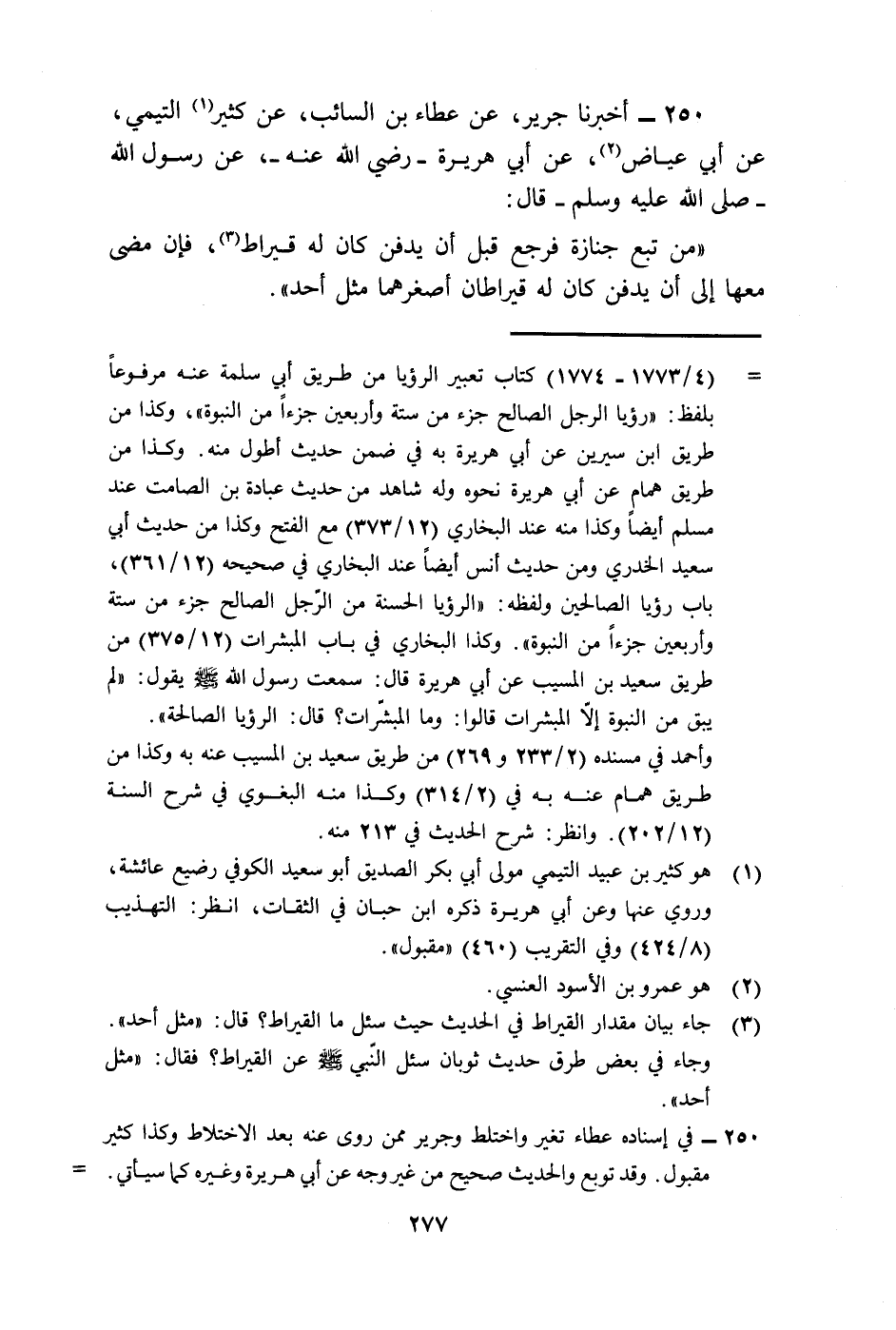 250 - أَخْبَرَنَا جَرِيرٌ، عَنْ عَطَاءِ بْنِ السَّائِبِ، عَنْ كَثِيرٍ التَّيْمِيِّ، عَنْ أَبِي عِيَاضٍ، عَنْ أَبِي هُرَيْرَةَ رَضِيَ اللَّهُ عَنْهُ، عَنْ رَسُولِ اللَّهِ صَلَّى اللهُ عَلَيْهِ وَسَلَّمَ قَالَ: «§مَنْ تَبِعَ جِنَازَةً فَرَجَعَ قَبْلَ أَنْ يُدْفَنَ كَانَ لَهُ قِيرَاطٌ فَإِنْ مَضَى مَعَهَا إِلَى أَنْ يُدْفَنَ كَانَ لَهُ قِيرَاطَانِ أَصْغَرُهُمَا مِثْلُ أُحُدٍ»