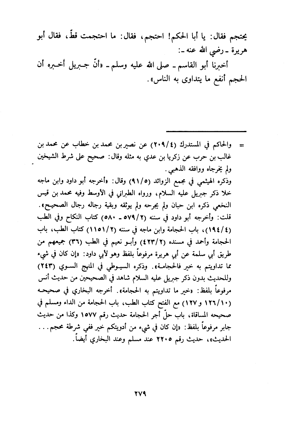 251- أَخْبَرَنَا زَكَرِيَا بْنُ عَدِيٍّ ، حَدَّثَنَا عُبَيْدُ اللَّهِ ، وَهُوَ ابْنُ عَمْرٍو الرَّقِّيُّ ، عَنْ زَيْدِ بْنِ أَبِي أُنَيْسَةَ ، عَنْ مُحَمَّدِ بْنِ قَيْسٍ ، قَالَ : سَمِعْتُ أَبَا الْحَكَمِ الْبَجَلِيَّ ، يَقُولُ : دَخَلْتُ عَلَى أَبِي هُرَيْرَةَ رَضِيَ اللَّهُ عَنْهُ وَهُوَ يَحْتَجِمُ ، فَقَالَ : يَا أَبَا الْحَكَمِ ، احْتَجِمْ ، فَقَالَ : مَا احْتَجَمْتُ قَطُّ ، فَقَالَ أَبُو هُرَيْرَةَ رَضِيَ اللَّهُ عَنْهُ : أَخْبَرَنَا أَبُو الْقَاسِمِ صَلَّى اللَّهُ عَلَيْهِ وَسَلَّمَ : أَنَّ جِبْرِيلَ أَخْبَرَهُ أَنَّ الْحَجْمَ أَنْفَعُ مَا يَتَدَاوَى بِهِ النَّاسُ.