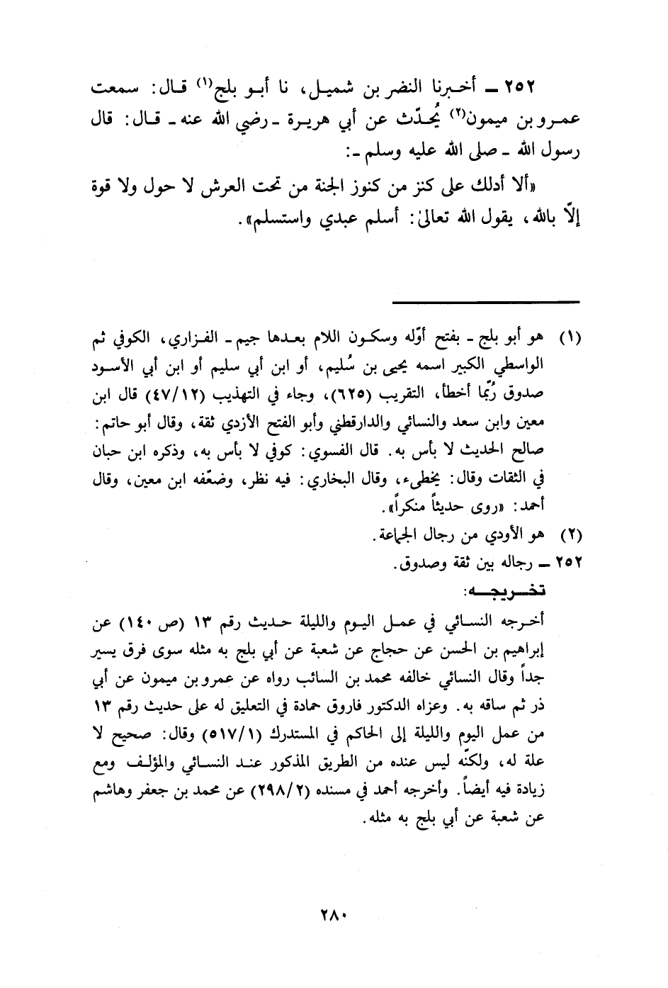 252 - أَخْبَرَنَا النَّضْرُ بْنُ شُمَيْلٍ، نا أَبُو بَلْجٍ، قَالَ: سَمِعْتُ عَمْرَو بْنَ مَيْمُونٍ، يُحَدِّثُ عَنْ أَبِي هُرَيْرَةَ رَضِيَ اللَّهُ عَنْهُ، قَالَ: قَالَ رَسُولُ اللَّهِ صَلَّى اللهُ عَلَيْهِ وَسَلَّمَ: " §أَلَا أَدُلُّكَ عَلَى كَنْزٍ مِنْ كُنُوزِ الْجَنَّةِ مِنْ تَحْتِ الْعَرْشِ لَا حَوْلَ وَلَا قُوَّةَ إِلَّا بِاللَّهِ يَقُولُ اللَّهُ تَعَالَى: أَسْلَمَ عَبْدِي وَاسْتَسْلَمَ ".