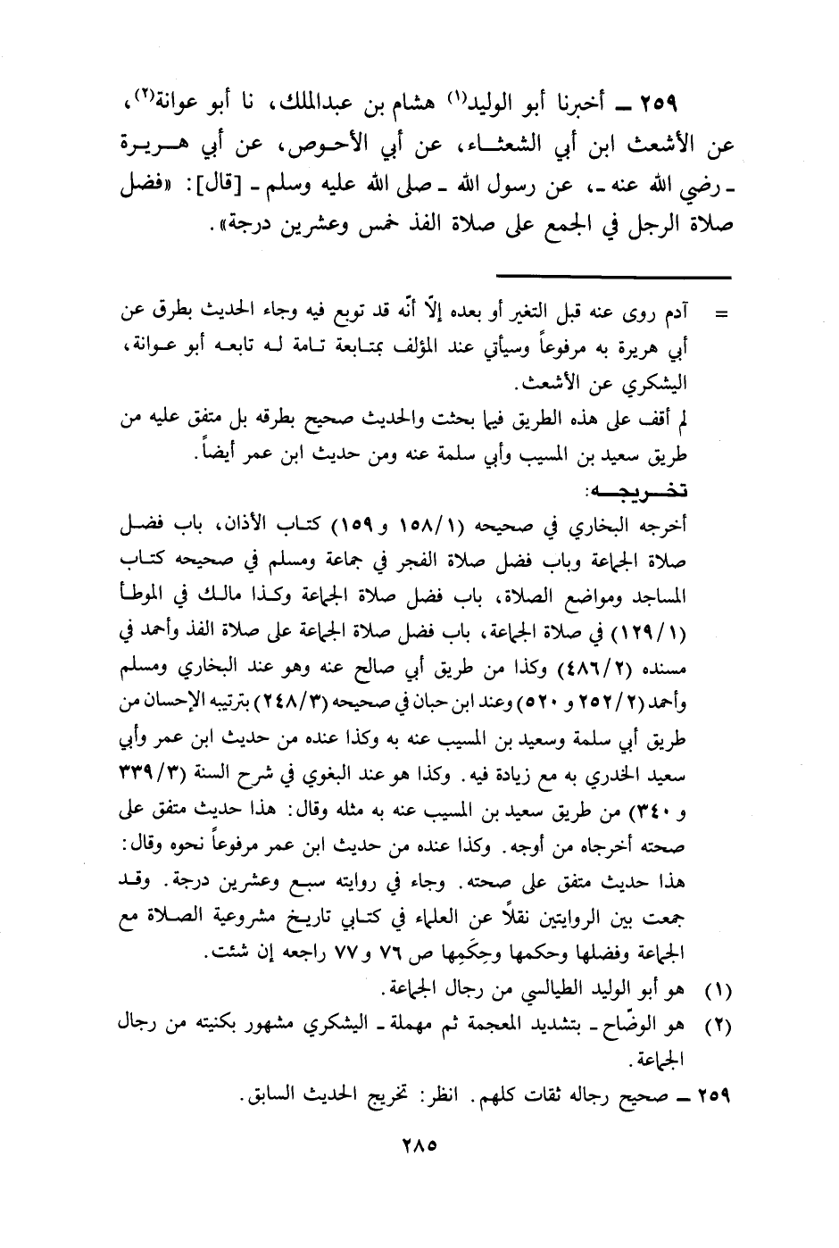 259 - أَخْبَرَنَا أَبُو الْوَلِيدِ هِشَامُ بْنُ عَبْدِ الْمَلِكِ، نا أَبُو عَوَانَةَ، عَنِ الْأَشْعَثِ بْنِ أَبِي الشَّعْثَاءِ، عَنْ أَبِي الْأَحْوَصِ، عَنْ أَبِي هُرَيْرَةَ رَضِيَ اللَّهُ عَنْهُ، عَنْ رَسُولِ اللَّهِ صَلَّى اللهُ عَلَيْهِ وَسَلَّمَ قَالَ: «§فَضْلُ صَلَاةِ الرَّجُلِ فِي الْجَمْعِ عَلَى صَلَاةِ الْفَذِّ خَمْسٌ وَعِشْرُونَ دَرَجَةً» .
