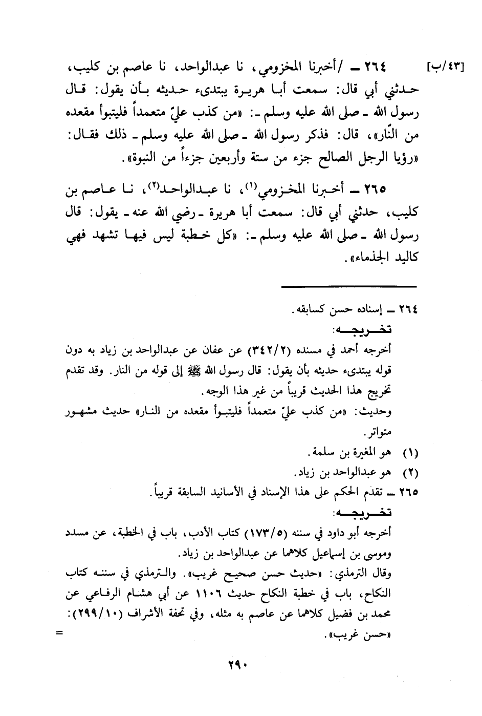 264 - أَخْبَرَنَا الْمَخْزُومِيُّ، نا عَبْدُ الْوَاحِدِ، نا عَاصِمُ بْنُ كُلَيْبٍ، حَدَّثَنِي أَبِي قَالَ: سَمِعْتُ أَبَا هُرَيْرَةَ، يَبْتَدِئُ حَدِيثَهُ بَأَنْ يَقُولَ: قَالَ رَسُولُ اللَّهِ صَلَّى اللهُ عَلَيْهِ وَسَلَّمَ: «§مَنْ كَذَبَ عَلَيَّ مُتَعَمِّدًا فَلْيَتَبَوَّأْ مَقْعَدَهُ مِنَ النَّارِ» ، قَالَ: فَذَكَرَ رَسُولُ اللَّهِ صَلَّى اللهُ عَلَيْهِ وَسَلَّمَ ذَلِكَ فَقَالَ: «رُؤْيَا الرَّجُلِ الصَّالِحِ جُزْءٌ مِنْ سِتَّةٍ وَأَرْبَعِينَ جُزْءًا مِنَ النُّبُوَّةِ» .