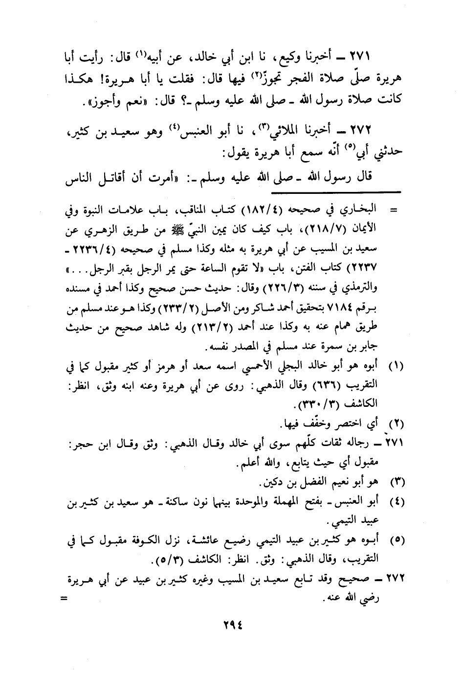 271 - أَخْبَرَنَا وَكِيعٌ، نا ابْنُ أَبِي خَالِدٍ، عَنْ أَبِيهِ، قَالَ: رَأَيْتُ أَبَا هُرَيْرَةَ §صَلَّى صَلَاةَ الْفَجْرِ تَجَوَّزَ فِيهَا، قَالَ: فَقُلْتُ: يَا أَبَا هُرَيْرَةَ هَكَذَا كَانَتْ صَلَاةُ رَسُولِ اللَّهِ صَلَّى اللهُ عَلَيْهِ وَسَلَّمَ قَالَ: «نَعَمْ، وَأَوْجَزَ» .