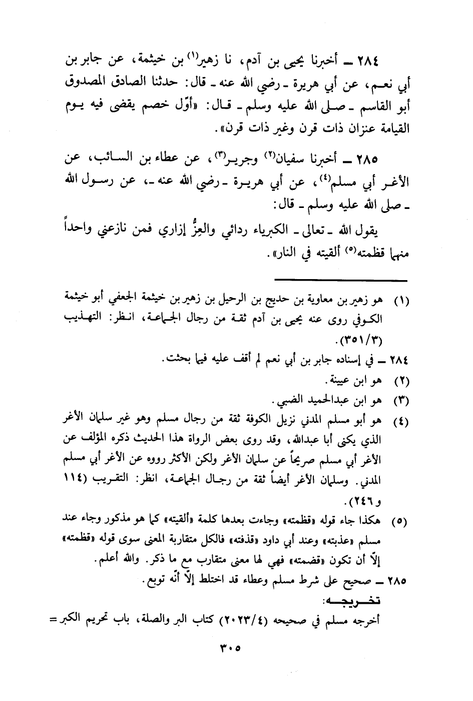 285 - أَخْبَرَنَا سُفْيَانُ، وَجَرِيرٌ، عَنْ عَطَاءِ بْنِ السَّائِبِ، عَنِ الْأَغَرِّ أَبِي مُسْلِمٍ، عَنْ أَبِي هُرَيْرَةَ رَضِيَ اللَّهُ عَنْهُ، عَنْ رَسُولِ اللَّهِ صَلَّى اللهُ عَلَيْهِ وَسَلَّمَ قَالَ: " يَقُولُ اللَّهُ تَعَالَى: §الْكِبْرِيَاءُ رِدَائِي وَالْعِزُّ إِزَارِي، فَمَنْ نَازَعَنِي وَاحِدًا مِنْهُمَا قَظَمْتُهُ أَلْقَيْتُهُ فِي النَّارِ ".