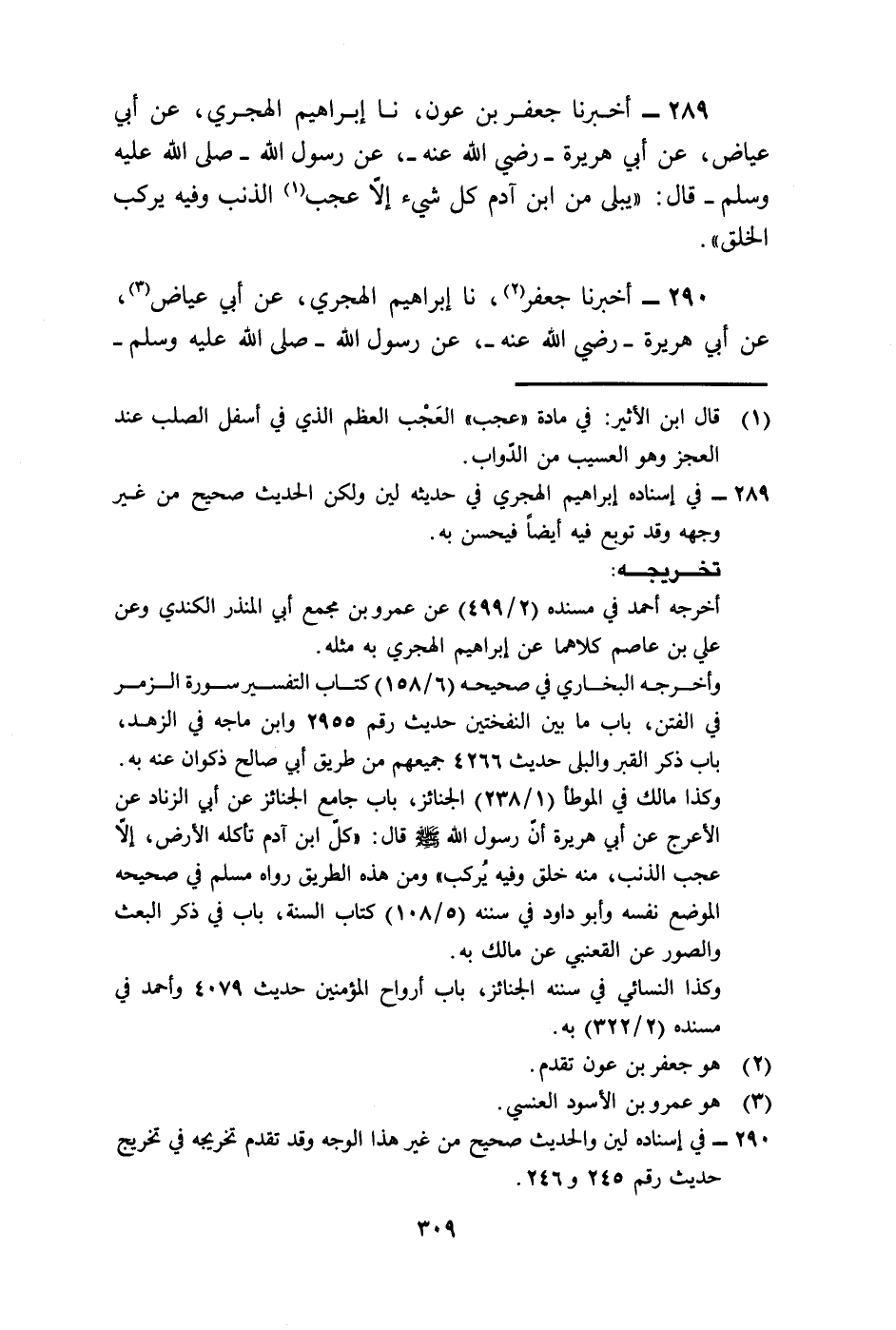289 - أَخْبَرَنَا جَعْفَرُ بْنُ عَوْنٍ، نا إِبْرَاهِيمُ الْهَجَرِيُّ، عَنْ أَبِي عِيَاضٍ، عَنْ أَبِي هُرَيْرَةَ رَضِيَ اللَّهُ عَنْهُ، عَنْ رَسُولِ اللَّهِ صَلَّى اللهُ عَلَيْهِ وَسَلَّمَ قَالَ: «§يَبْلَى مِنِ ابْنِ آدَمَ كُلُّ شَيْءٍ إِلَّا عَجَبُ الذَّنَبِ وَفِيهِ يُرَكَّبُ الْخَلْقُ» .