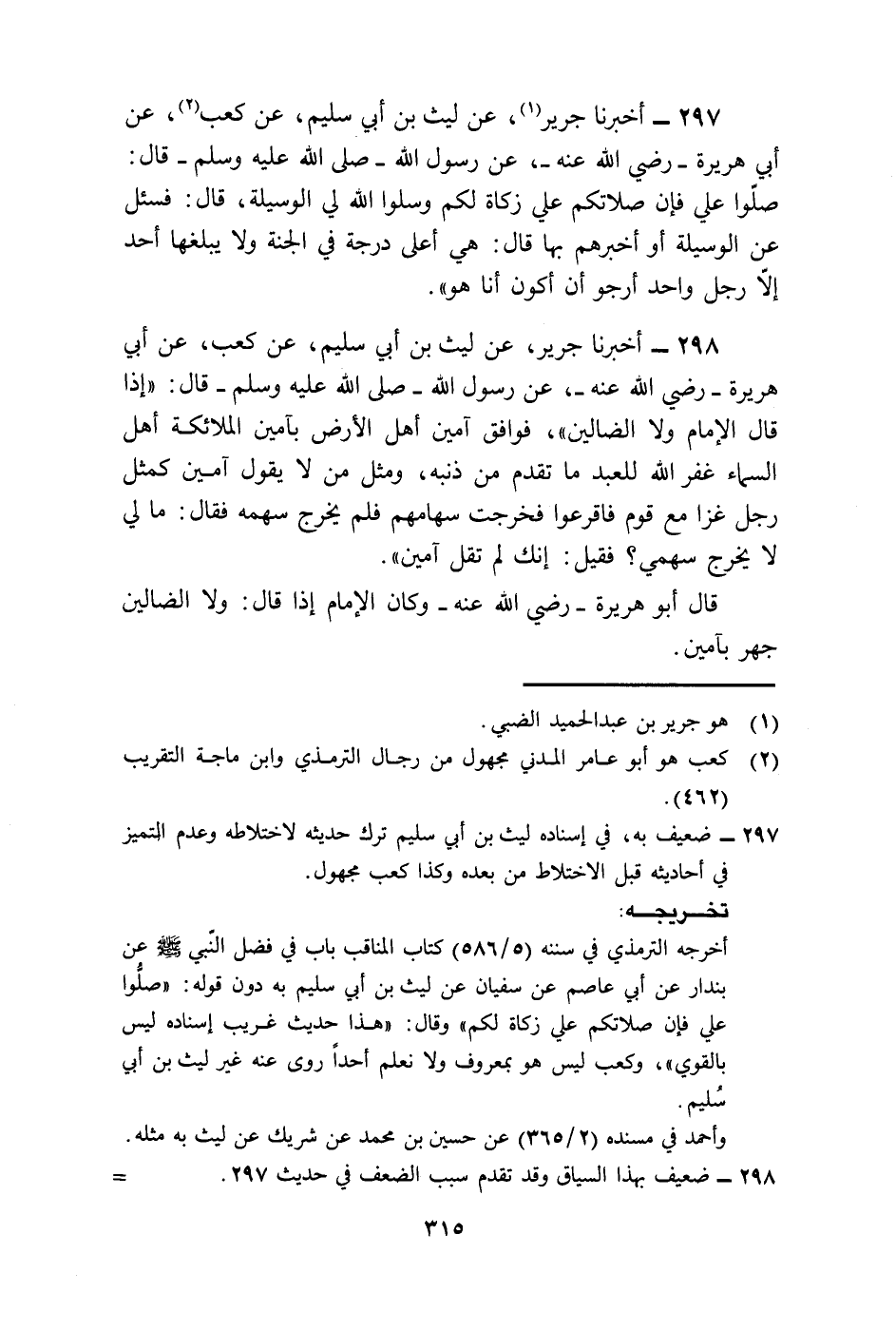 297 - أَخْبَرَنَا جَرِيرٌ، عَنْ لَيْثِ بْنِ أَبِي سُلَيْمٍ، عَنْ كَعْبٍ، عَنْ أَبِي هُرَيْرَةَ رَضِيَ اللَّهُ عَنْهُ، عَنْ رَسُولِ اللَّهِ صَلَّى اللهُ عَلَيْهِ وَسَلَّمَ قَالَ: §صَلُّوا عَلَيَّ فَإِنَّ صَلَاتَكُمْ عَلَيَّ زَكَاةٌ لَكُمْ وَسَلُوا اللَّهَ لِيَ الْوَسِيلَةَ قَالَ: فَسُئِلَ عَنِ الْوَسِيلَةِ أَوْ أَخْبَرَهُمْ بِهَا، قَالَ: هِيَ أَعْلَى دَرَجَةٍ فِي الْجَنَّةِ وَلَا يَبْلُغُهَا أَحَدٌ إِلَّا رَجُلٌ وَاحِدٌ أَرْجُو أَنْ أَكُونَ أَنَا هُوَ.