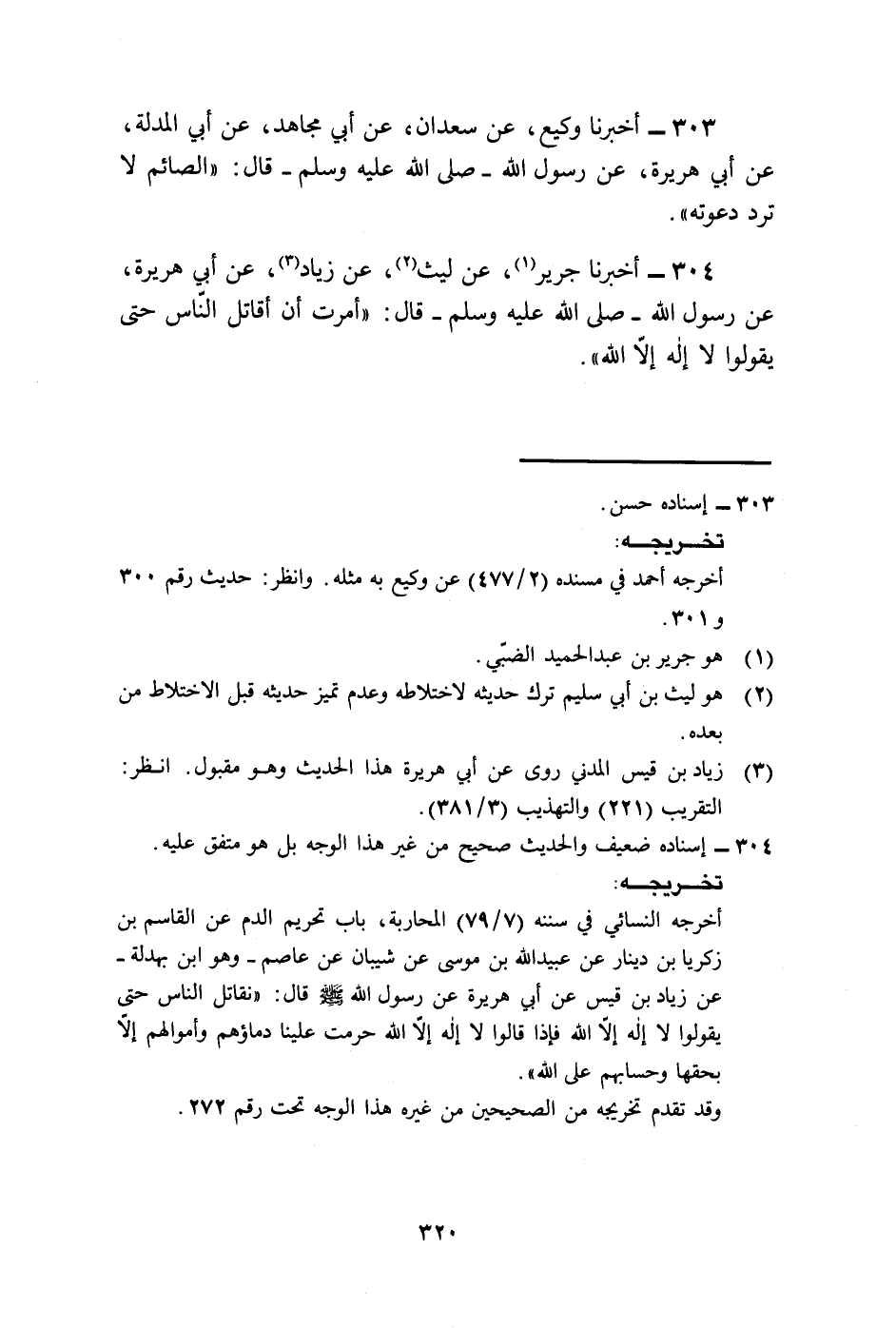 304 - أَخْبَرَنَا جَرِيرٌ، عَنْ لَيْثٍ، عَنْ زِيَادٍ، عَنْ أَبِي هُرَيْرَةَ، عَنْ رَسُولِ اللَّهِ صَلَّى اللهُ عَلَيْهِ وَسَلَّمَ قَالَ: «§أُمِرْتُ أَنْ أُقَاتِلَ النَّاسَ حَتَّى يَقُولُوا لَا إِلَهَ إِلَّا اللَّهُ» .