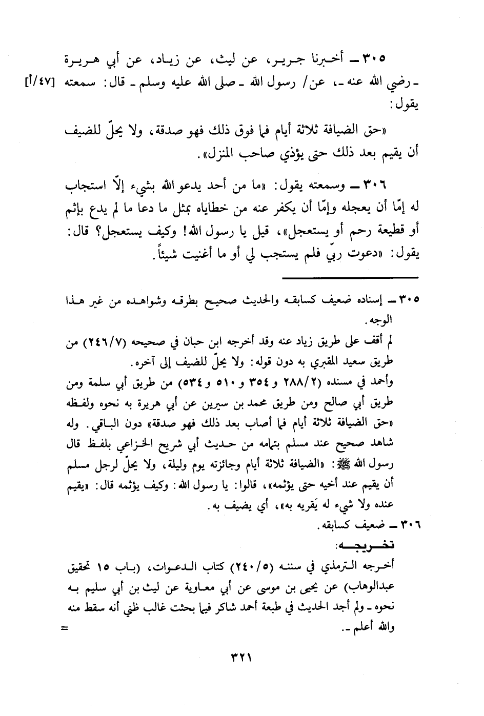 305 - أَخْبَرَنَا جَرِيرٌ، عَنْ لَيْثٍ، عَنْ زِيَادٍ، عَنْ أَبِي هُرَيْرَةَ رَضِيَ اللَّهُ عَنْهُ، عَنْ رَسُولِ اللَّهِ صَلَّى اللهُ عَلَيْهِ وَسَلَّمَ قَالَ: «§حَقُّ الضِّيَافَةِ ثَلَاثَةُ أَيَّامٍ فَمَا فَوْقَ ذَلِكَ فَهُوَ صَدَقَةٌ، وَلَا يَحِلُّ لِلضَّيْفِ أَنْ يُقِيمَ بَعْدَ ذَلِكَ حَتَّى يُؤْذِيَ صَاحِبَ الْمَنْزِلِ»