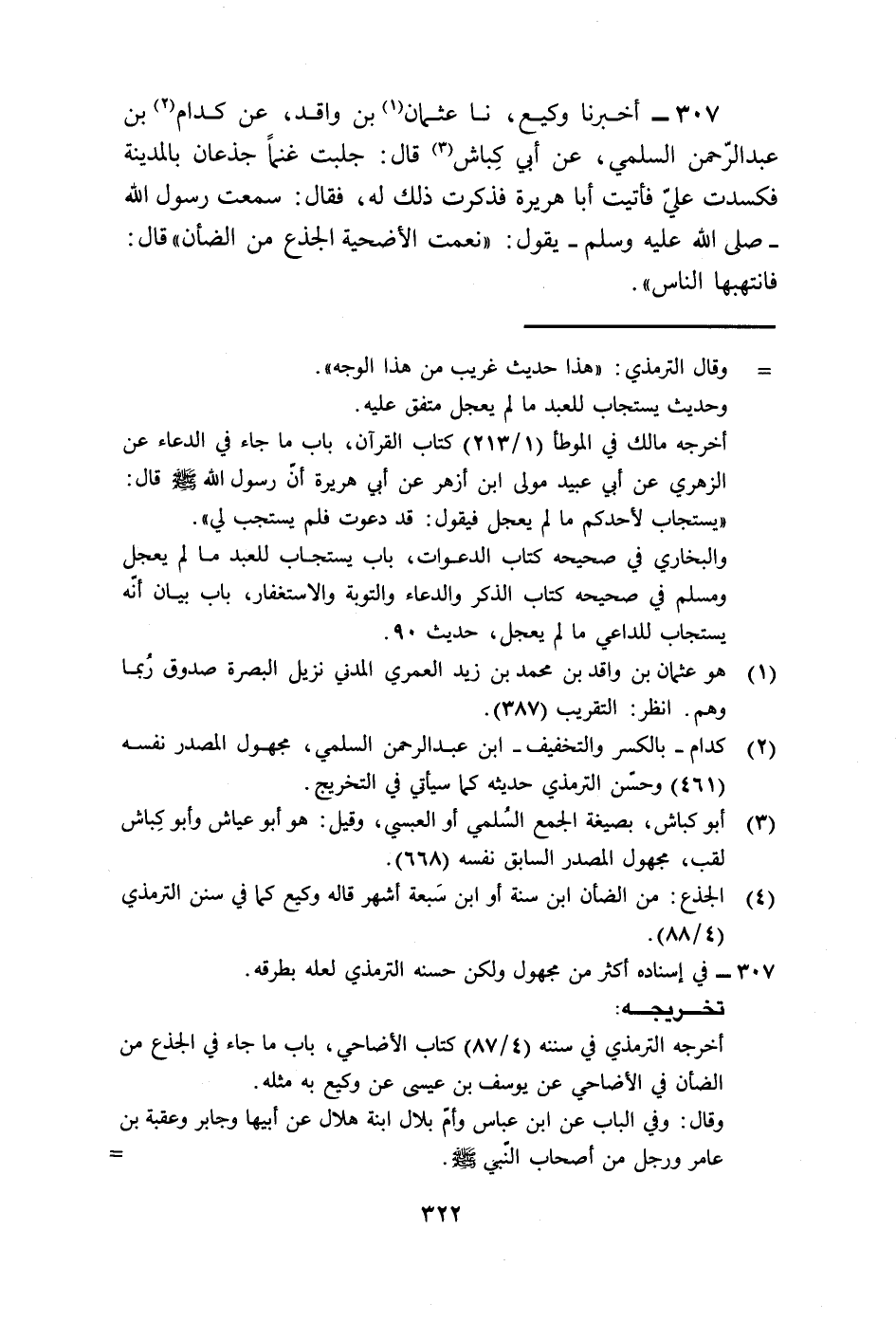 307 - أَخْبَرَنَا وَكِيعٌ، نا عُثْمَانُ بْنُ وَاقِدٍ، عَنْ كِدَامِ بْنِ عَبْدِ الرَّحْمَنِ السُّلَمِيِّ، عَنْ أَبِي كِبَاشٍ، قَالَ: جَلَبْتُ غَنَمًا جُذْعَانًا بِالْمَدِينَةِ فَكَسَدَتْ عَلَيَّ، فَأَتَيْتُ أَبَا هُرَيْرَةَ فَذَكَرْتُ ذَلِكَ لَهُ، فَقَالَ: سَمِعْتُ رَسُولَ اللَّهِ صَلَّى اللهُ عَلَيْهِ وَسَلَّمَ يَقُولُ: «§نِعْمَتِ الْأُضْحِيَّةُ الْجَذَعُ مِنَ الضَّأْنِ» ، قَالَ: فَانْتَهَبَهَا النَّاسُ