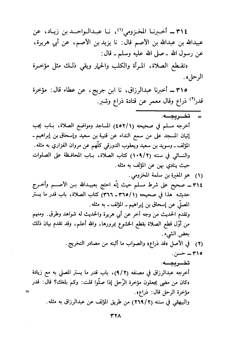 314 - أَخْبَرَنَا الْمَخْزُومِيُّ، نا عَبْدُ الْوَاحِدِ بْنُ زِيَادٍ، عَنْ عُبَيْدِ اللَّهِ بْنِ عَبْدِ اللَّهِ بْنِ الْأَصَمِّ، قَالَ: نا يَزِيدُ بْنُ الْأَصَمِّ، عَنْ أَبِي هُرَيْرَةَ، عَنْ رَسُولِ اللَّهِ صَلَّى اللهُ عَلَيْهِ وَسَلَّمَ قَالَ: «§تَقْطَعُ الصَّلَاةَ الْمَرْأَةُ، وَالْكَلْبُ، وَالْحِمَارُ» ، وَيَقِي ذَلِكَ مِثْلُ مُؤَخِّرَةِ الرَّحْلِ.