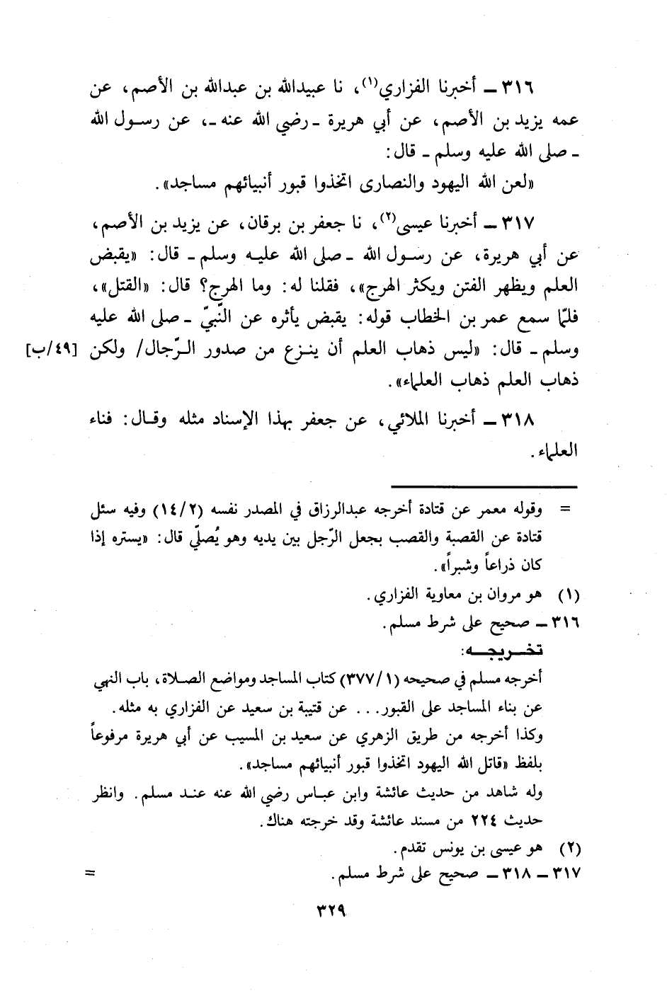 316 - أَخْبَرَنَا الْفَزَارِيُّ، نا عُبَيْدُ اللَّهِ بْنُ عَبْدِ اللَّهِ بْنِ الْأَصَمِّ، عَنْ عَمِّهِ، يَزِيدَ بْنِ الْأَصَمِّ، عَنْ أَبِي هُرَيْرَةَ رَضِيَ اللَّهُ عَنْهُ، عَنْ رَسُولِ اللَّهِ صَلَّى اللهُ عَلَيْهِ وَسَلَّمَ قَالَ: «§لَعَنَ اللَّهُ الْيَهُودَ وَالنَّصَارَى، اتَّخَذُوا قُبُورَ أَنْبِيَائِهِمْ مَسَاجِدَ» .