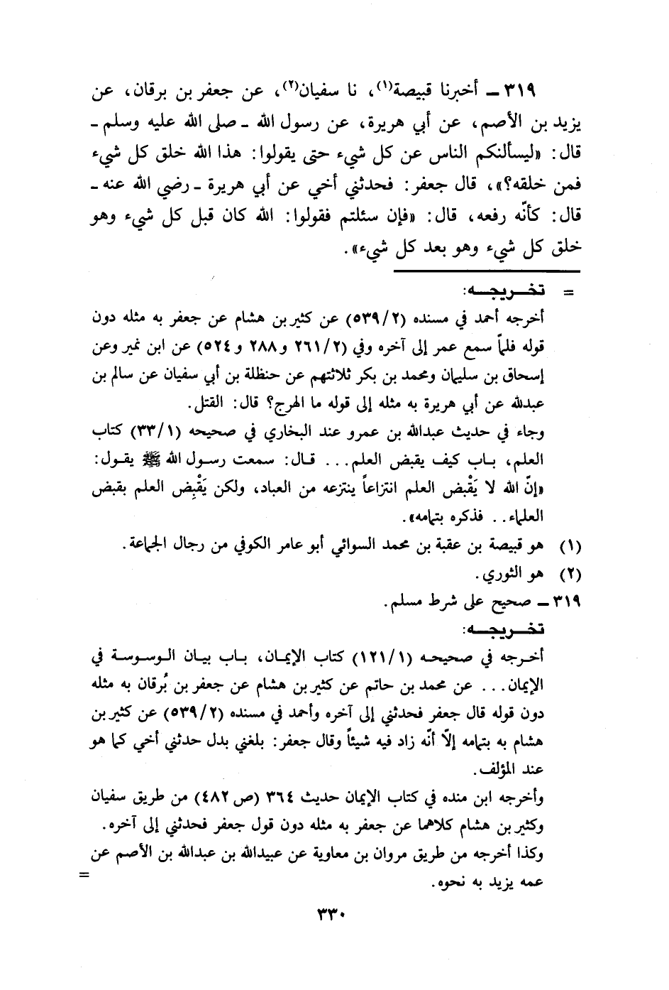 319 - أَخْبَرَنَا قَبِيصَةُ، نا سُفْيَانُ، عَنْ جَعْفَرِ بْنِ بُرْقَانَ، عَنْ يَزِيدَ بْنِ الْأَصَمِّ، عَنْ أَبِي هُرَيْرَةَ، عَنْ رَسُولِ اللَّهِ صَلَّى اللهُ عَلَيْهِ وَسَلَّمَ قَالَ: " §لَيَسْأَلَنَّكُمُ النَّاسُ عَنْ كُلِّ شَيْءٍ حَتَّى يَقُولُوا: هَذَا اللَّهُ خَلَقَ كُلَّ شَيْءٍ، فَمَنْ خَلَقَهُ؟ " قَالَ جَعْفَرٌ: فحَدَّثَنِي أَخِي، عَنْ أَبِي هُرَيْرَةَ رَضِيَ اللَّهُ عَنْهُ قَالَ: كَأَنَّهُ رَفَعَهُ قَالَ: " فَإِنْ سُئِلْتُمْ فَقُولُوا: اللَّهُ كَانَ قَبْلَ كُلِّ شَيْءٍ، وَهُوَ خَلَقَ كُلَّ شَيْءٍ، وَهُوَ بَعْدَ كُلِّ شَيْءٍ ".