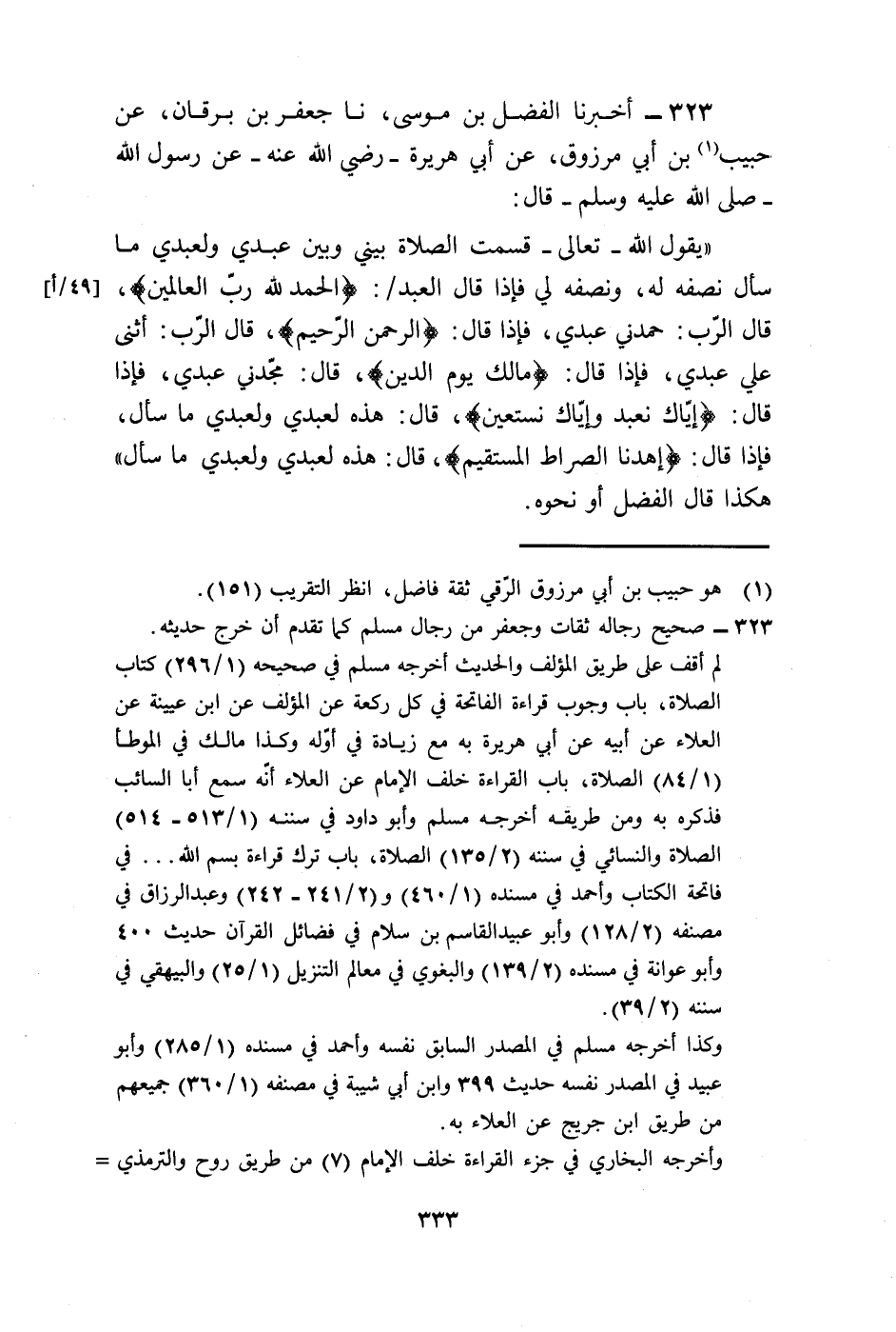 323 - أَخْبَرَنَا الْفَضْلُ بْنُ مُوسَى، نا جَعْفَرُ بْنُ بُرْقَانَ، عَنْ حَبِيبِ بْنِ أَبِي مَرْزُوقٍ، عَنْ أَبِي هُرَيْرَةَ رَضِيَ اللَّهُ عَنْهُ، عَنْ رَسُولِ اللَّهِ صَلَّى اللهُ عَلَيْهِ وَسَلَّمَ قَالَ: يَقُولُ اللَّهُ تَعَالَى: " §قَسَمْتُ الصَّلَاةَ بَيْنِي وَبَيْنَ عَبْدِي، وَلِعَبْدِي مَا سَأَلَ، نِصْفُهُ لَهُ وَنِصْفُهُ لِي، فَإِذَا قَالَ الْعَبْدُ: {الْحَمْدُ لِلَّهِ رَبِّ الْعَالَمِينَ} [الفاتحة: 2] ، قَالَ الرَّبُّ: حَمِدَنِي عَبْدِي، فَإِذَا قَالَ: {الرَّحْمَنِ الرَّحِيمِ} [الفاتحة: 1] ، قَالَ الرَّبُّ: أَثْنَى عَلَيَّ عَبْدِي، فَإِذَا قَالَ: {مَالِكَ يَوْمِ الدَّينِ} ، قَالَ: مَجَّدَنِي عَبْدِي، فَإِذَا قَالَ: {إِيَّاكَ نَعْبُدُ وَإِيَّاكَ نَسْتَعِينُ} [الفاتحة: 5] ، قَالَ: هَذِهِ لِعَبْدِي، وَلِعَبْدِي مَا سَأَلَ، فَإِذَا قَالَ: {اهْدِنَا الصِّرَاطَ الْمُسْتَقِيمَ} [الفاتحة: 6] ، قَالَ: هَذِهِ لِعَبْدِي وَلِعَبْدِي مَا سَأَلَ "، هَكَذَا قَالَ الْفَضْلُ أَوْ نَحْوُهُ.