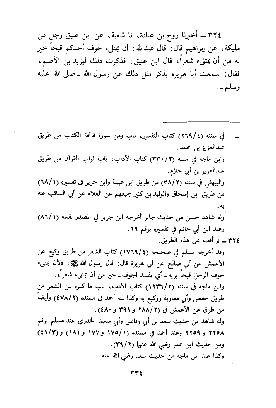324 - أَخْبَرَنَا رَوْحُ بْنُ عُبَادَةَ، نا شُعْبَةُ، عَنِ ابْنِ عَتِيقٍ، رَجُلٌ مِنْ مَلِيكَةَ، عَنْ إِبْرَاهِيمَ، قَالَ: قَالَ عَبْدُ اللَّهِ: «§أَنْ يَمْتَلِئَ جَوْفُ أَحَدِكُمْ قَيْحًا خَيْرٌ لَهُ مِنْ أَنْ يَمْتَلِئَ شِعْرًا» ، قَالَ ابْنُ عَتِيقٍ: فَذَكَرْتُ ذَلِكَ لِيَزِيدَ بْنِ الْأَصَمِّ، فَقَالَ: سَمِعْتُ أَبَا هُرَيْرَةَ يَذْكُرُ مِثْلَ ذَلِكَ عَنْ رَسُولِ اللَّهِ صَلَّى اللهُ عَلَيْهِ وَسَلَّمَ