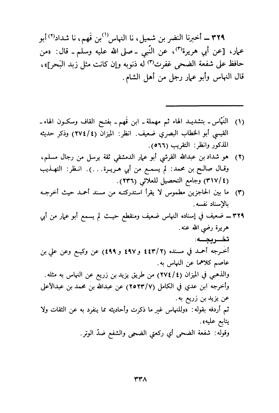 329 - أَخْبَرَنَا النَّضْرُ بْنُ شُمَيْلٍ، نا النَّهَّاسُ بْنُ قَهْمٍ، نا شَدَّادٌ أَبُو عَمَّارٍ، عَنْ أَبِي هُرَيْرَةَ، عَنِ النَّبِيِّ صَلَّى اللهُ عَلَيْهِ وَسَلَّمَ قَالَ: «§مَنْ حَافَظَ عَلَى شُفْعَةِ الضُّحَى غُفِرَتْ لَهُ ذُنُوبُهُ، وَإِنْ كَانَتْ مِثْلَ زَبَدِ الْبَحْرِ» قَالَ النَّهَّاسُ: وَأَبُو عَمَّارٍ رَجُلٌ مِنْ أَهْلِ الشَّامِ