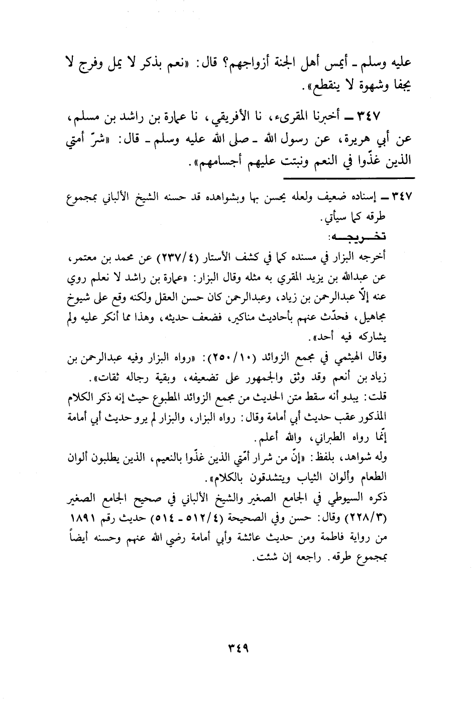 347- أَخْبَرَنَا الْمُقْرِئُ ، حَدَّثَنَا الأَفْرِيقِيُّ ، حَدَّثَنَا عُمَارَةُ بْنُ رَاشِدِ بْنِ مُسْلِمٍ ، عَنْ أَبِي هُرَيْرَةَ ، عَنْ رَسُولِ اللَّهِ صَلَّى اللَّهُ عَلَيْهِ وَسَلَّمَ قَالَ : شَرُّ أُمَّتِي الَّذِينَ غُذُّوا فِي النِّعَمِ وَنَبَتَتْ عَلَيْهِمْ أَجْسَامُهُمْ.