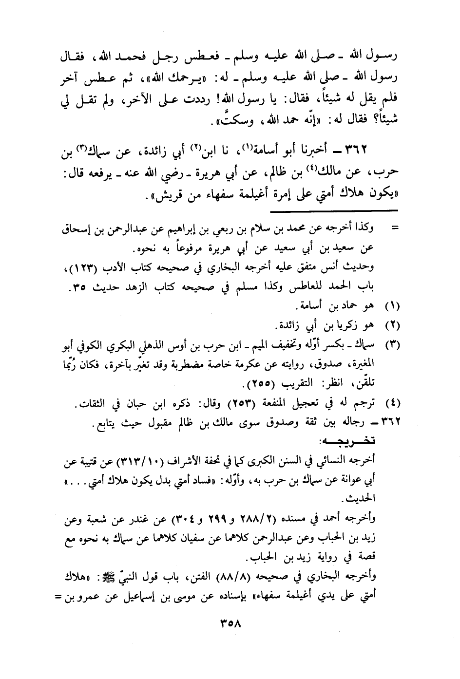 362 - أَخْبَرَنَا أَبُو أُسَامَةَ، نا ابْنُ أَبِي زَائِدَةَ، عَنْ سِمَاكِ بْنِ حَرْبٍ، عَنْ مَالِكِ بْنِ ظَالِمٍ، عَنْ أَبِي هُرَيْرَةَ رَضِيَ اللَّهُ عَنْهُ يَرْفَعُهُ، قَالَ: «§يَكُونُ هَلَاكُ أُمَّتِي عَلَى إِمْرَةِ أُغَيْلِمَةٍ سُفَهَاءَ مِنْ قُرَيْشٍ» .
