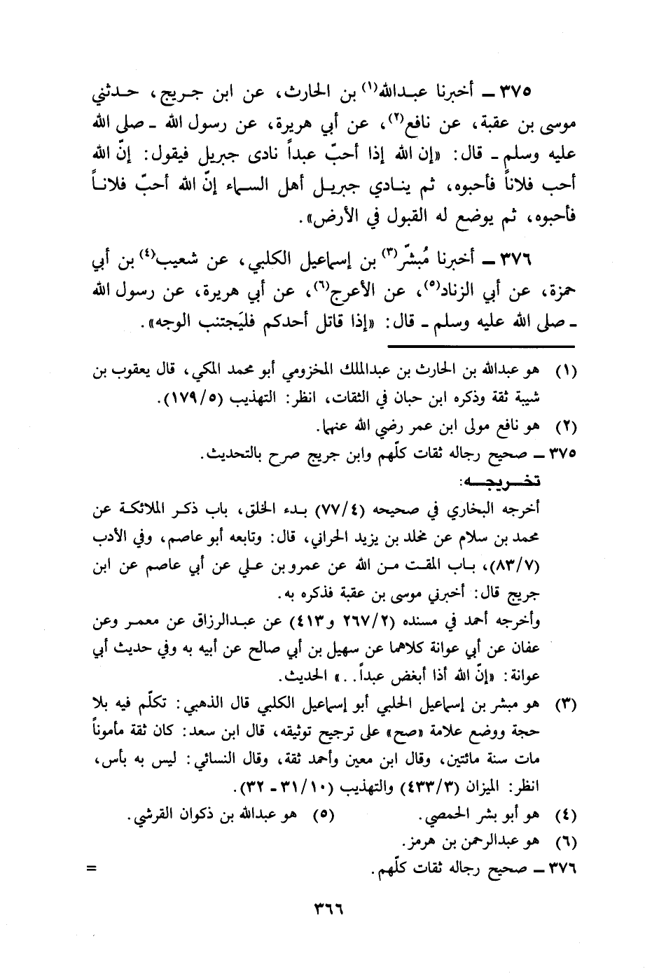 375 - أَخْبَرَنَا عَبْدُ اللَّهِ بْنُ الْحَارِثِ، عَنِ ابْنِ جُرَيْجٍ، حَدَّثَنِي مُوسَى بْنُ عُقْبَةَ، عَنْ نَافِعٍ، عَنْ أَبِي هُرَيْرَةَ، عَنْ رَسُولِ اللَّهِ صَلَّى اللهُ عَلَيْهِ وَسَلَّمَ قَالَ: " §إِنَّ اللَّهَ إِذَا أَحَبَّ عَبْدًا نَادَى جِبْرِيلَ فَيَقُولُ: إِنَّ اللَّهَ أَحَبَّ فُلَانًا فَأَحِبُّوهُ، ثُمَّ يُنَادِي جِبْرِيلُ أَهْلَ السَّمَاءِ إِنَّ اللَّهَ أَحَبَّ فُلَانًا فَأَحِبُّوهُ، ثُمَّ يُوضَعُ لَهُ الْقَبُولُ فِي الْأَرْضِ ".