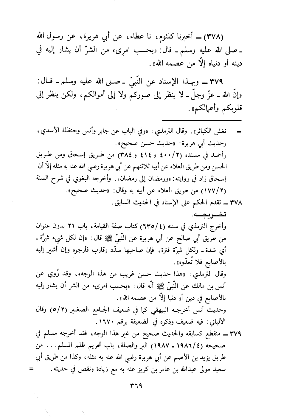 378 - أَخْبَرَنَا كُلْثُومٌ، نا عَطَاءٌ، عَنْ أَبِي هُرَيْرَةَ، عَنْ رَسُولِ اللَّهِ صَلَّى اللهُ عَلَيْهِ وَسَلَّمَ قَالَ: «§بِحَسْبِ امْرِئٍ مِنَ الشَّرِّ أَنْ يُشَارَ إِلَيْهِ فِي دِينِهِ أَوْ دُنْيَاهُ إِلَّا مَنْ عَصَمَهُ اللَّهُ» .
