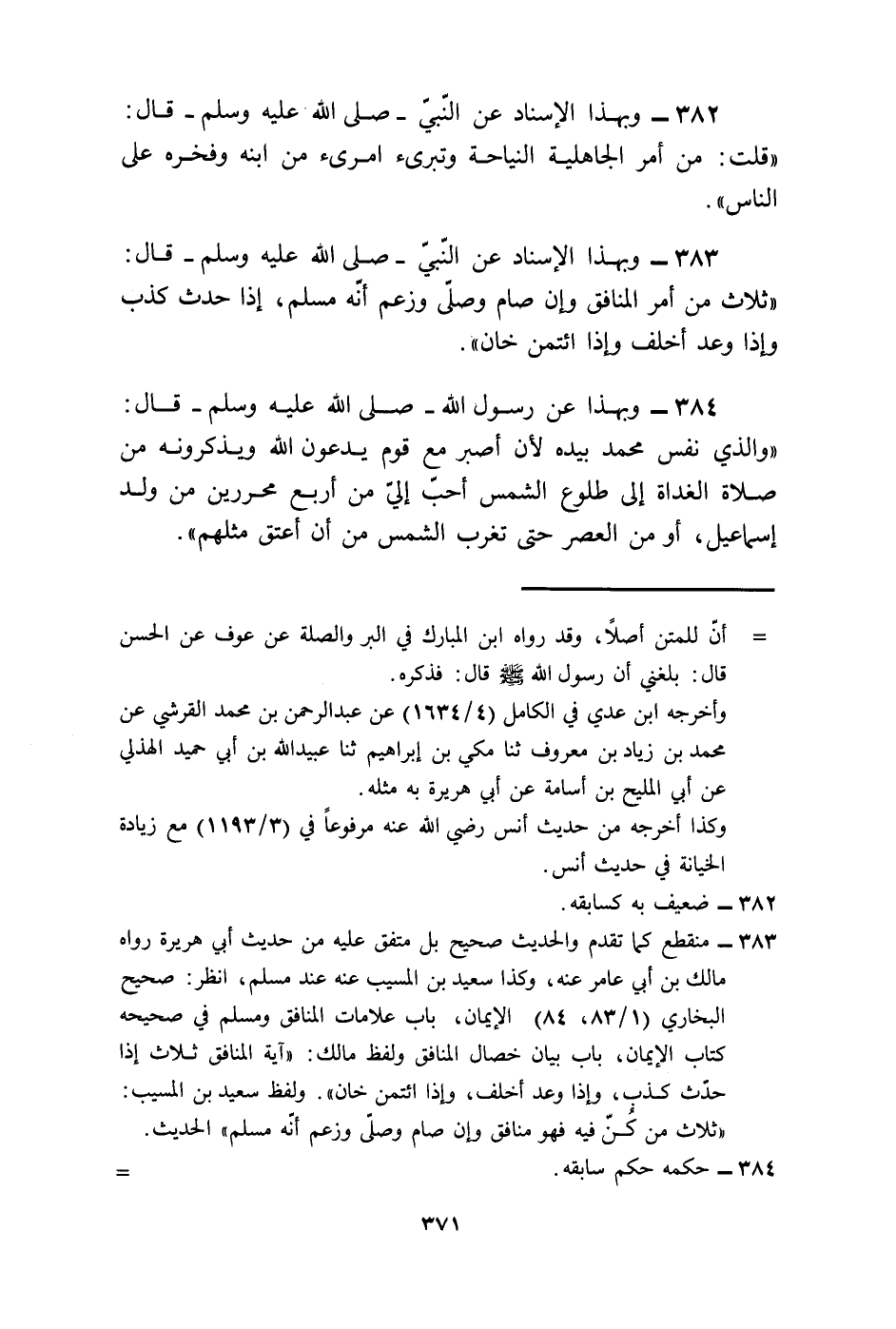 383 - وَبِهَذَا الْإِسْنَادِ، عَنِ النَّبِيِّ صَلَّى اللهُ عَلَيْهِ وَسَلَّمَ قَالَ: " §ثَلَاثٌ مِنْ أَمْرِ الْمُنَافِقِ وَإِنْ صَامَ وَصَلَّى وَزَعَمَ أَنَّهُ مُسْلِمٌ: إِذَا حَدَّثَ كَذَبَ وَإِذَا وَعَدَ أَخْلَفَ وَإِذَا ائْتُمِنَ خَانَ "