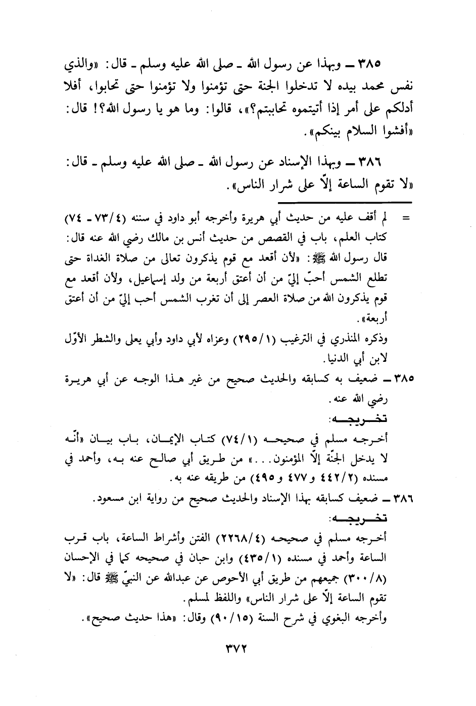 385 - وَبِهَذَا، عَنْ رَسُولِ اللَّهِ صَلَّى اللهُ عَلَيْهِ وَسَلَّمَ قَالَ: «وَالَّذِي نَفْسُ مُحَمَّدٍ بِيَدِهِ §لَا تَدْخُلُوا الْجَنَّةَ حَتَّى تُؤْمِنُوا وَلَا تُؤْمِنُوا حَتَّى تَحَابُّوا أَفَلَا أَدُلُّكُمْ عَلَى أَمْرٍ إِذَا أَتَيْتُمُوهُ تَحَابَبْتُمْ؟» قَالُوا: وَمَا هُوَ يَا رَسُولَ اللَّهِ؟ قَالَ: «أَفْشُوا السَّلَامَ بَيْنَكُمْ»