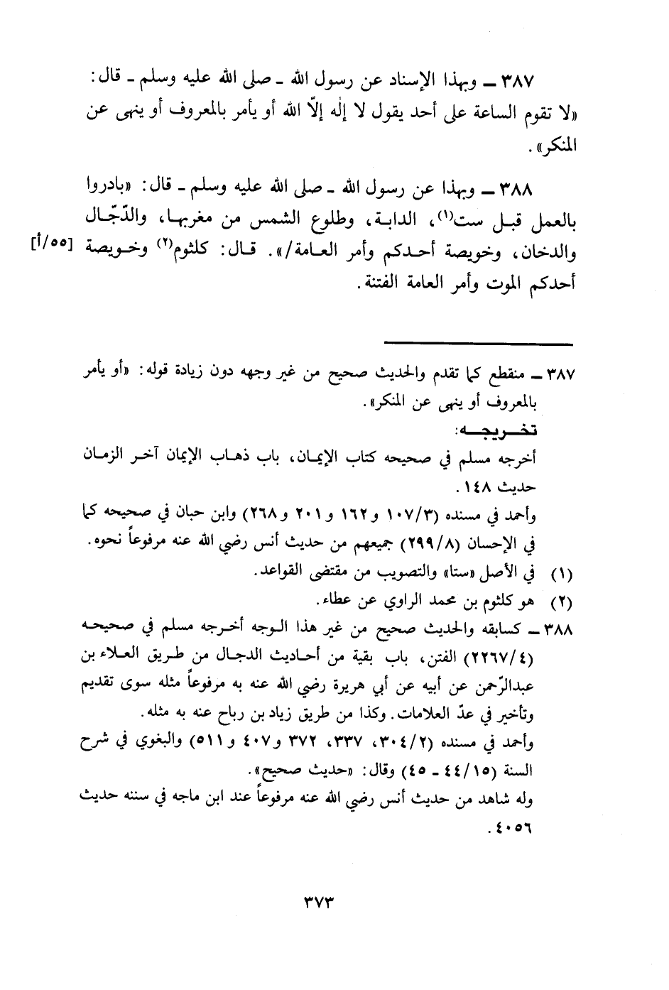 388 - وَبِهَذَا، عَنْ رَسُولِ اللَّهِ صَلَّى اللهُ عَلَيْهِ وَسَلَّمَ قَالَ: «§بَادِرُوا بِالْعَمَلِ قَبْلَ سِتٍ، الدَّابَّةِ وَطُلُوعِ الشَّمْسِ مِنْ مَغْرِبِهَا، وَالدَّجَّالِ وَالدُّخَانِ، وَخُوَيْصَةِ أَحَدِكُمْ، وَأَمْرِ الْعَامَّةِ» ، قَالَ كُلْثُومٌ: وَخُوَيْصَةُ أَحَدِكُمُ الْمَوْتُ وَأَمْرُ الْعَامَّةِ الْفِتْنَةُ