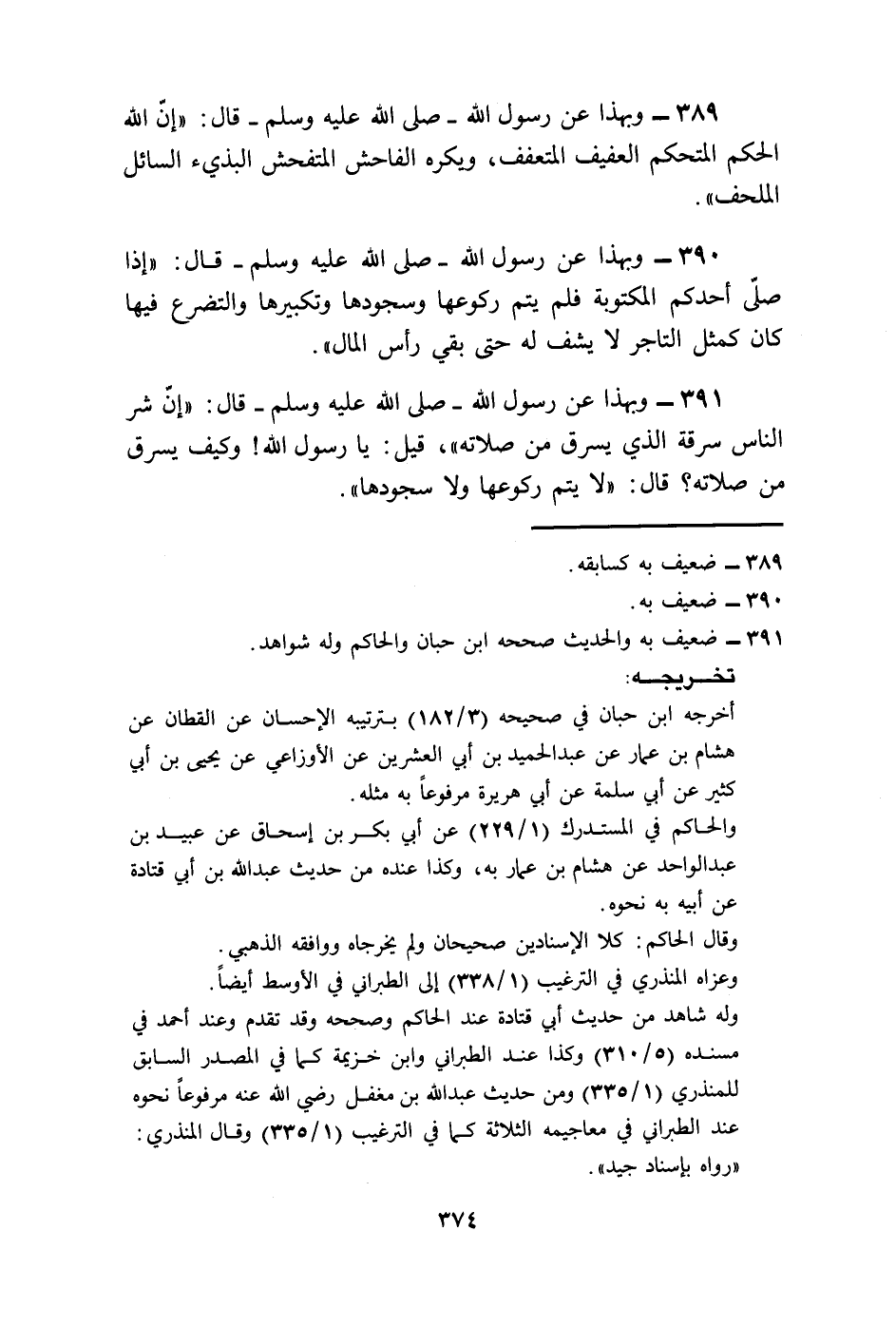 391 - وَبِهَذَا، عَنْ رَسُولِ اللَّهِ صَلَّى اللهُ عَلَيْهِ وَسَلَّمَ قَالَ: «§إِنَّ شَرَّ النَّاسِ سَرِقَةً الَّذِي يَسْرِقُ مِنْ صَلَاتِهِ» قِيلَ: يَا رَسُولَ اللَّهِ، وَكَيْفَ يَسْرِقُ مِنْ صَلَاتِهِ؟ قَالَ: «لَا يُتِمُّ رُكُوعَهَا وَلَا سُجُودَهَا» .