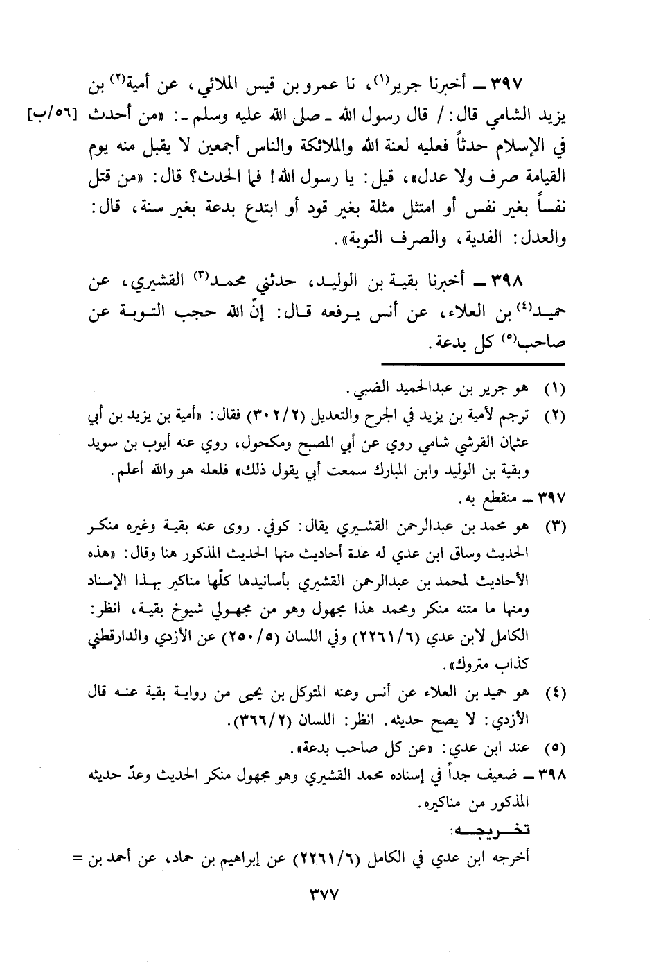 397 - أَخْبَرَنَا جَرِيرٌ، نا عَمْرُو بْنُ قَيْسٍ الْمُلَائِيُّ، عَنْ أُمَيَّةَ بْنِ يَزِيدَ الشَّامِيِّ، قَالَ: قَالَ رَسُولُ اللَّهِ صَلَّى اللهُ عَلَيْهِ وَسَلَّمَ: «§مَنْ أَحْدَثَ فِي الْإِسْلَامِ حَدَثًا فَعَلَيْهِ لَعْنَةُ اللَّهِ وَالْمَلَائِكَةِ وَالنَّاسِ أَجْمَعِينَ، لَا يُقْبَلُ مِنْهُ يَوْمَ الْقِيَامَةِ صَرْفٌ وَلَا عَدْلٌ» قِيلَ: يَا رَسُولَ اللَّهِ فَمَا الْحَدَثُ؟ قَالَ: «مَنْ قَتَلَ نَفْسًا بِغَيْرِ نَفْسٍ، أَوِ امْتَثَلَ مُثْلَةً بِغَيْرِ قَوَدٍ، أَوِ ابْتَدَعَ بِدْعَةً بِغَيْرِ سُنَّةٍ» ، قَالَ: وَالْعَدْلُ الْفِدْيَةُ، وَالصَّرْفُ التَّوْبَةُ.