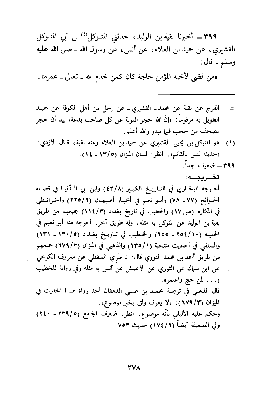 399 - أَخْبَرَنَا بَقِيَّةُ بْنُ الْوَلِيدِ، حَدَّثَنِي الْمُتَوَكِّلُ بْنُ أَبِي الْمُتَوَكِّلِ الْقُشَيْرِيُّ، عَنْ حُمَيْدِ بْنِ الْعَلَاءِ، عَنْ أَنَسٍ، عَنْ رَسُولِ اللَّهِ صَلَّى اللهُ عَلَيْهِ وَسَلَّمَ قَالَ: «§مَنْ قَضَى لِأَخِيهِ الْمُؤْمِنِ حَاجَةً كَانَ كَمَنْ خَدَمَ اللَّهَ تَعَالَى عُمُرَهُ» .