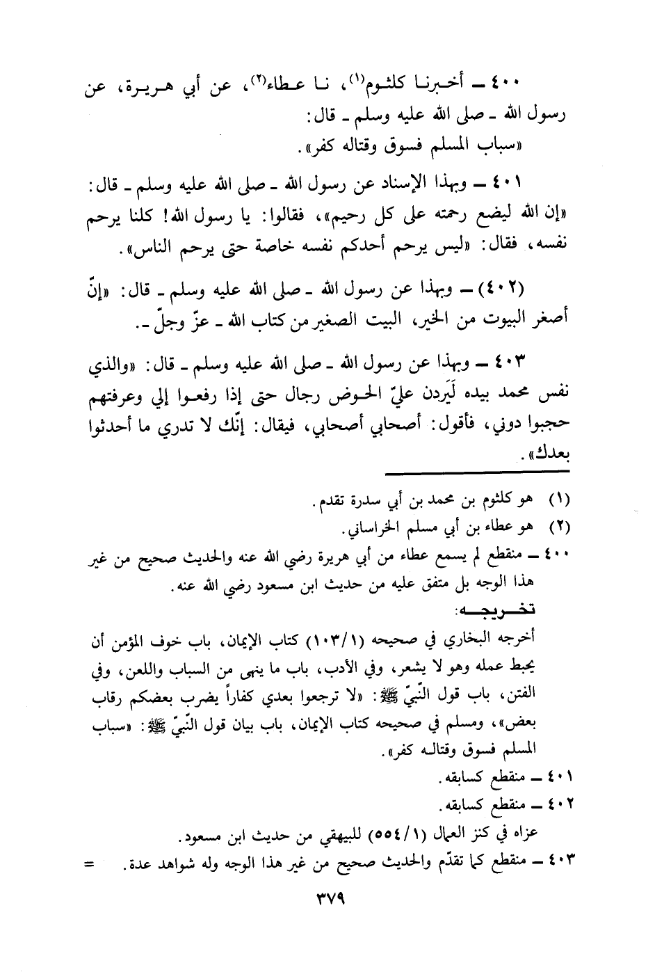 400 - أَخْبَرَنَا كُلْثُومٌ، نا عَطَاءٌ، عَنْ أَبِي هُرَيْرَةَ، عَنْ رَسُولِ اللَّهِ صَلَّى اللهُ عَلَيْهِ وَسَلَّمَ قَالَ: «§سِبَابُ الْمُسْلِمِ فُسُوقٌ وَقِتَالُهُ كُفْرٌ»