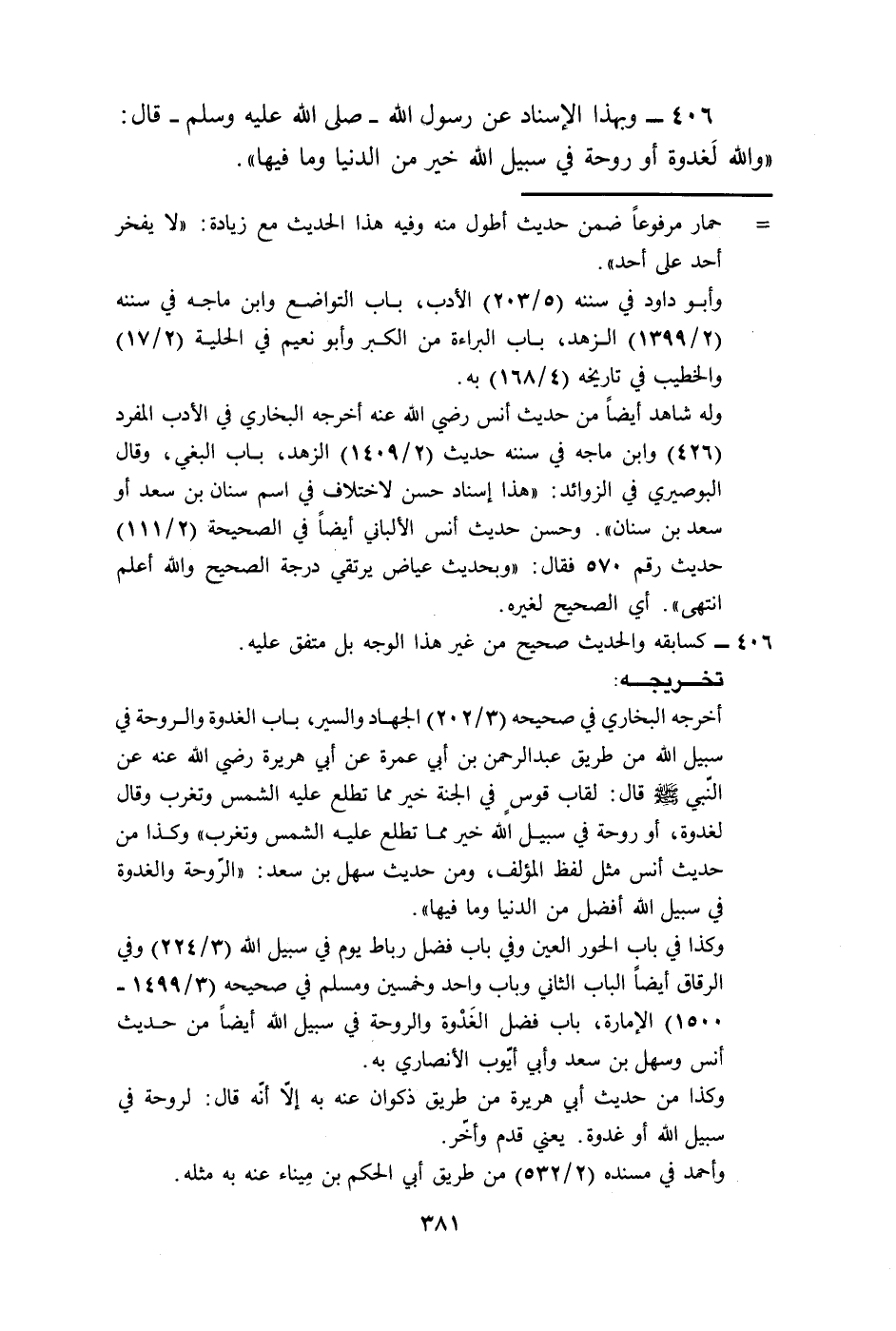 406 - وَبِهَذَا الْإِسْنَادِ، عَنْ رَسُولِ اللَّهِ صَلَّى اللهُ عَلَيْهِ وَسَلَّمَ قَالَ: «§وَاللَّهِ لَغَدْوَةٌ أَوْ رَوْحَةٌ فِي سَبِيلِ اللَّهِ خَيْرٌ مِنَ الدُّنْيَا وَمَا فِيهَا»