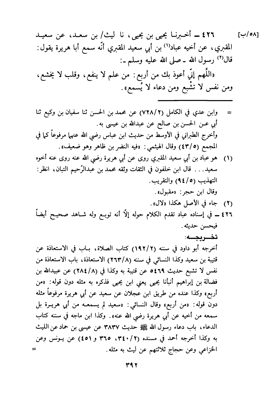 426 - أَخْبَرَنَا يَحْيَى بْنُ يَحْيَى، نا لَيْثُ بْنُ سَعْدٍ، عَنْ سَعِيدٍ الْمَقْبُرِيِّ، عَنْ أَخِيهِ عَبَّادِ بْنِ أَبِي سَعِيدٍ الْمَقْبُرِيِّ أَنَّهُ سَمِعَ أَبَا هُرَيْرَةَ، يَقُولُ: قَالَ رَسُولُ اللَّهِ صَلَّى اللهُ عَلَيْهِ وَسَلَّمَ: " §اللَّهُمَّ إِنِّي أَعُوذُ بِكَ مِنْ أَرْبَعٍ: مِنْ عِلْمٍ لَا يَنْفَعُ وَقَلْبٍ لَا يَخْشَعُ، وَمِنْ نَفْسٍ لَا تَشْبَعُ، وَمِنْ دُعَاءٍ لَا يُسْمَعُ ".