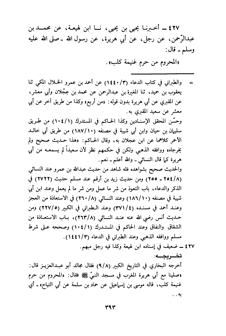 427 - أَخْبَرَنَا يَحْيَى بْنُ يَحْيَى، نا ابْنُ لَهِيعَةَ، عَنْ مُحَمَّدِ بْنِ عَبْدِ الرَّحْمَنِ، عَنْ رَجُلٍ، عَنْ أَبِي هُرَيْرَةَ، عَنْ رَسُولِ اللَّهِ صَلَّى اللهُ عَلَيْهِ وَسَلَّمَ قَالَ: «§الْمَحْرُومُ مَنْ حُرِمَ غَنِيمَةَ كَلْبٍ» .