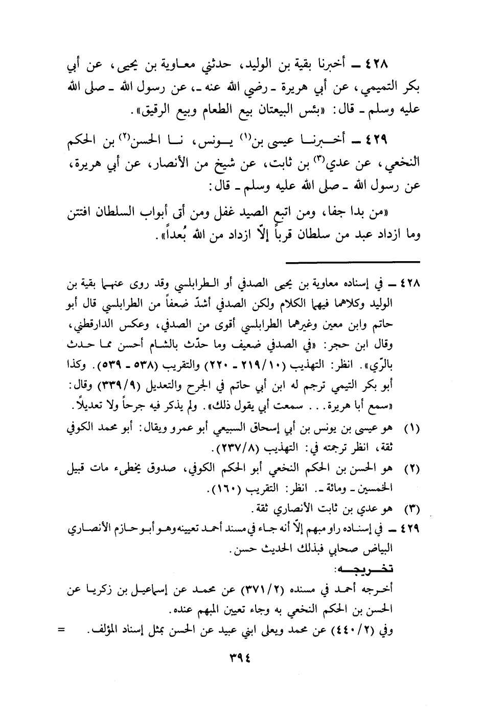 428 - أَخْبَرَنَا بَقِيَّةُ بْنُ الْوَلِيدِ، حَدَّثَنِي مُعَاوِيَةَ بْنُ يَحْيَى، عَنْ أَبِي بَكْرٍ التَّمِيمِيِّ، عَنْ أَبِي هُرَيْرَةَ رَضِيَ اللَّهُ عَنْهُ، عَنْ رَسُولِ اللَّهِ صَلَّى اللهُ عَلَيْهِ وَسَلَّمَ قَالَ: «§بِئْسَ الْبَيْعَتَانِ بَيْعُ الطَّعَامِ وَبَيْعُ الرَّقِيقِ» .