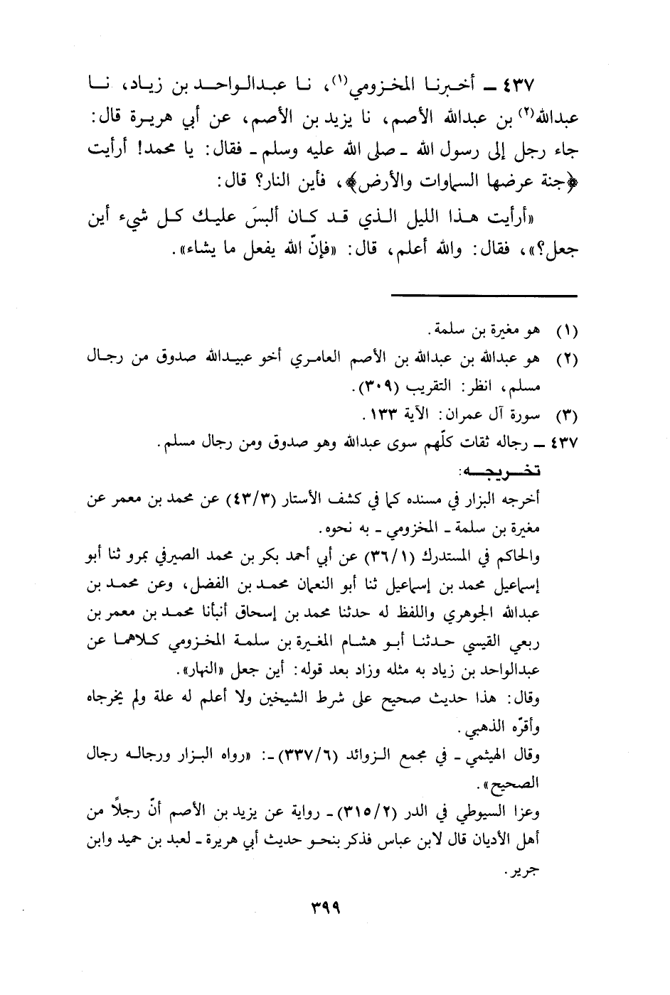 437 - أَخْبَرَنَا الْمَخْزُومِيُّ، نا عَبْدُ الْوَاحِدِ بْنُ زِيَادٍ، نا عَبْدُ اللَّهِ بْنُ عَبْدِ اللَّهِ بْنِ الْأَصَمِّ، نا يَزِيدُ بْنُ الْأَصَمِّ، عَنْ أَبِي هُرَيْرَةَ، قَالَ: جَاءَ رَجُلٌ إِلَى رَسُولِ اللَّهِ صَلَّى اللهُ عَلَيْهِ وَسَلَّمَ فَقَالَ: يَا مُحَمَّدُ أَرَأَيْتَ §جَنَّةً عَرْضُهَا السَّمَوَاتُ وَالْأَرْضُ، فَأَينَ النَّارُ؟ قَالَ: «أَرَأَيْتَ هَذَا اللَّيْلَ الَّذِي قَدْ كَانَ أَلْبَسَ عَلَيْكَ كُلَّ شَيْءٍ، أَيْنَ جُعِلَ؟» فَقَالَ: اللَّهُ أَعْلَمُ، قَالَ: «فَإِنَّ اللَّهَ يَفْعَلُ مَا يَشَاءُ» .