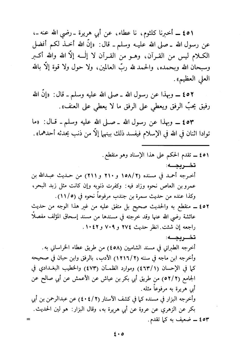 451 - أَخْبَرَنَا كُلْثُومٌ، نا عَطَاءٌ، عَنْ أَبِي هُرَيْرَةَ رَضِيَ اللَّهُ عَنْهُ، عَنْ رَسُولِ اللَّهِ صَلَّى اللهُ عَلَيْهِ وَسَلَّمَ قَالَ: «§إِنَّ اللَّهَ أَخَذَ لَكُمْ أَفْضَلَ الْكَلَامِ لَيْسَ مِنَ الْقُرْآنِ وَهُوَ مِنَ الْقُرْآنِ لَا إِلَهَ إِلَّا اللَّهُ، وَاللَّهُ أَكْبَرُ، وَسُبْحَانَ اللَّهِ وَبِحَمْدِهِ، وَالْحَمْدُ لِلَّهِ رَبِّ الْعَالَمِينَ، وَلَا حَوْلَ وَلَا قُوَّةَ إِلَّا بِاللَّهِ الْعَلِيِّ الْعَظِيمِ» .