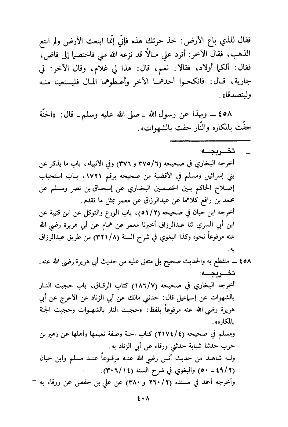 458 - وَبِهَذَا، عَنْ رَسُولِ اللَّهِ صَلَّى اللهُ عَلَيْهِ وَسَلَّمَ قَالَ: «§الْجَنَّةُ حُفَّتْ بِالْمَكَارِهِ، وَالنَّارُ حُفَّتْ بِالشَّهَوَاتِ»