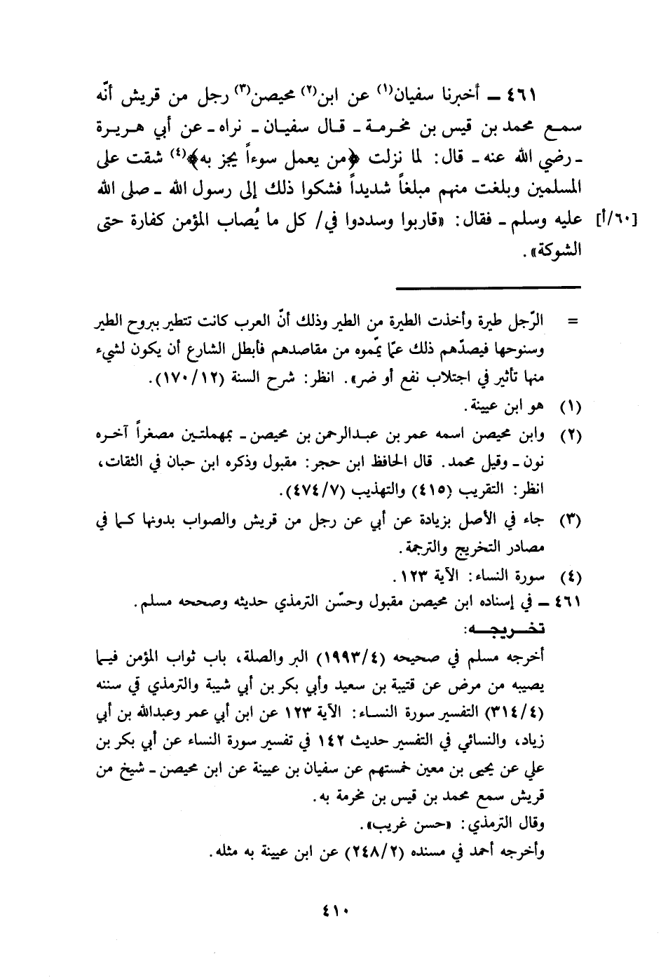 أَخْبَرَنَا سُفْيَانُ، عَنِ ابْنِ مُحَيْصِنٍ رَجُلٌ مِنْ قُرَيْشٍ أَنَّهُ سَمِعَ مُحَمَّدَ بْنَ قَيْسِ بْنِ مَخْرَمَةَ، قَالَ سُفْيَانُ: نَرَاهُ عَنْ أَبِي هُرَيْرَةَ رَضِيَ اللَّهُ عَنْهُ قَالَ: لَمَّا نَزَلَتْ: {§مَنْ يَعْمَلْ سُوءًا يُجْزَ بِهِ} [النساء: 123] شَقَّتْ عَلَى الْمُسْلِمِينَ وَبَلَغَتْ مِنْهُمْ مَبْلَغًا شَدِيدًا، فَشَكَوْا ذَلِكَ إِلَى رَسُولِ اللَّهِ صَلَّى اللهُ عَلَيْهِ وَسَلَّمَ فَقَالَ: «قَارِبُوا وَسَدِّدُوا فِي كُلِّ مَا يُصَابُ الْمُؤْمِنُ كَفَّارَةٌ حَتَّى الشَّوْكَةِ» .