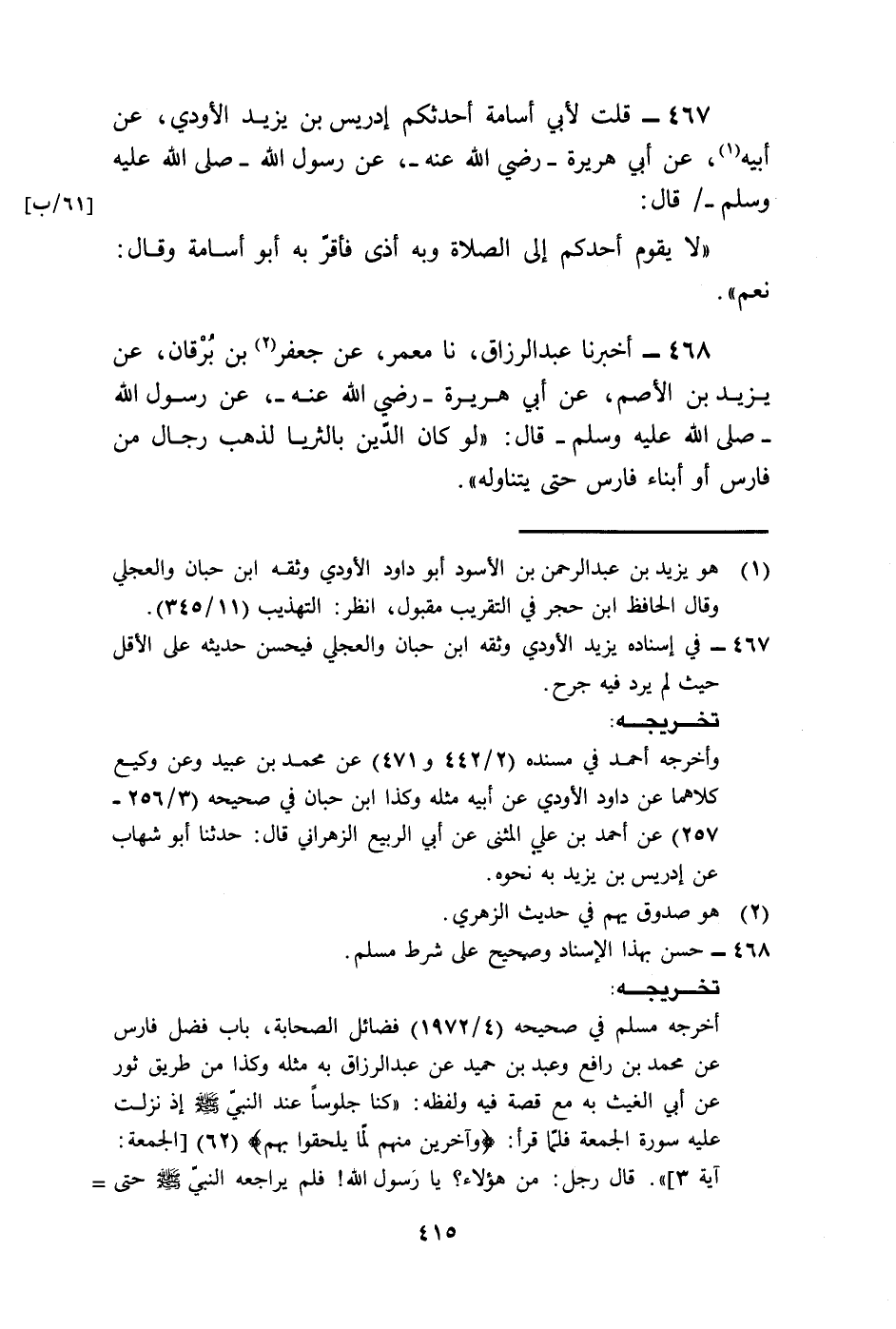 468 - أَخْبَرَنَا عَبْدُ الرَّزَّاقِ، نا مَعْمَرٌ، عَنْ جَعْفَرِ بْنِ بُرْقَانَ، عَنْ يَزِيدَ بْنِ الْأَصَمِّ، عَنْ أَبِي هُرَيْرَةَ رَضِيَ اللَّهُ عَنْهُ، عَنْ رَسُولِ اللَّهِ صَلَّى اللهُ عَلَيْهِ وَسَلَّمَ قَالَ: §لَوْ كَانَ الدِّينُ بِالثُّرَيَّا لَذَهَبَ رِجَالٌ مِنْ فَارِسَ أَوْ أَبْنَاءِ فَارِسَ حَتَّى يَتَنَاوَلَهُ ".