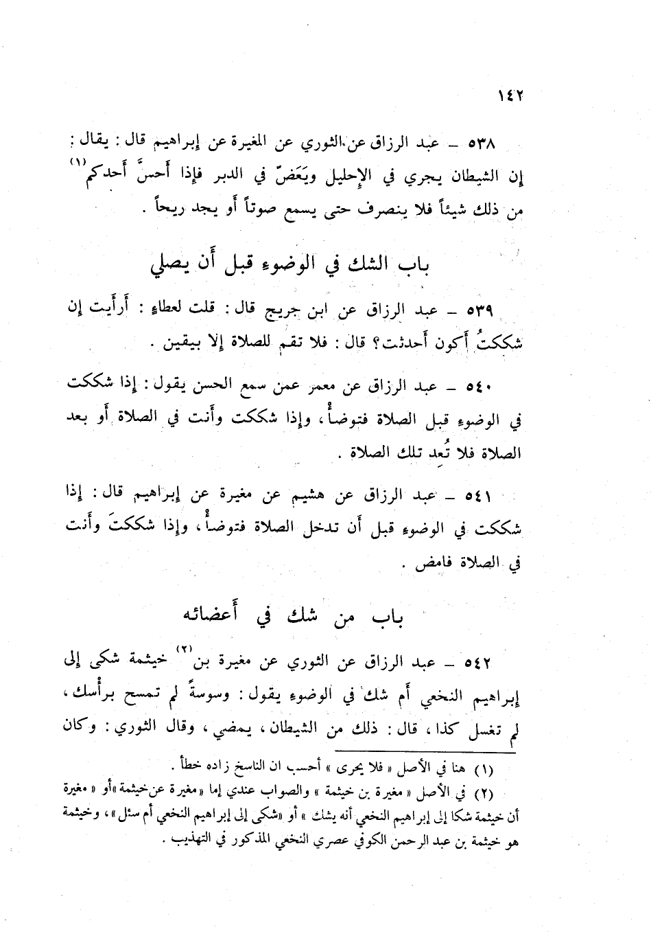 ٥٤٢ - عَبْدُ الرَّزَّاقِ، عَنِ الثَّوْرِيِّ، عَنْ مُغِيرَةَ بْنِ خَيْثَمَةَ، شَكَى إِلَى إِبْرَاهِيمَ النَّخَعِيِّ، أَمْ شَكَّ فِي الْوُضُوءِ يَقُولُ: وَسْوَسَةً لَمْ تَمْسَحْ بِرَأْسِكَ، لَمْ تَغْسِلْ كَذَا قَالَ: «ذَلِكَ مِنَ الشَّيْطَانِ يَمْضِي»، وَقَالَ الثَّوْرِيُّ: وَكَانَ يُقَالُ: «إِذَا ابْتَدَأَ ذَلِكَ أَنْ يُعِيدَ فَإِذَا جَعَلَهُ يَكْثُرُ عَلَيْهِ فَلَا يُعِيدُ الْوُضُوءَ وَالصَّلَاةَ»