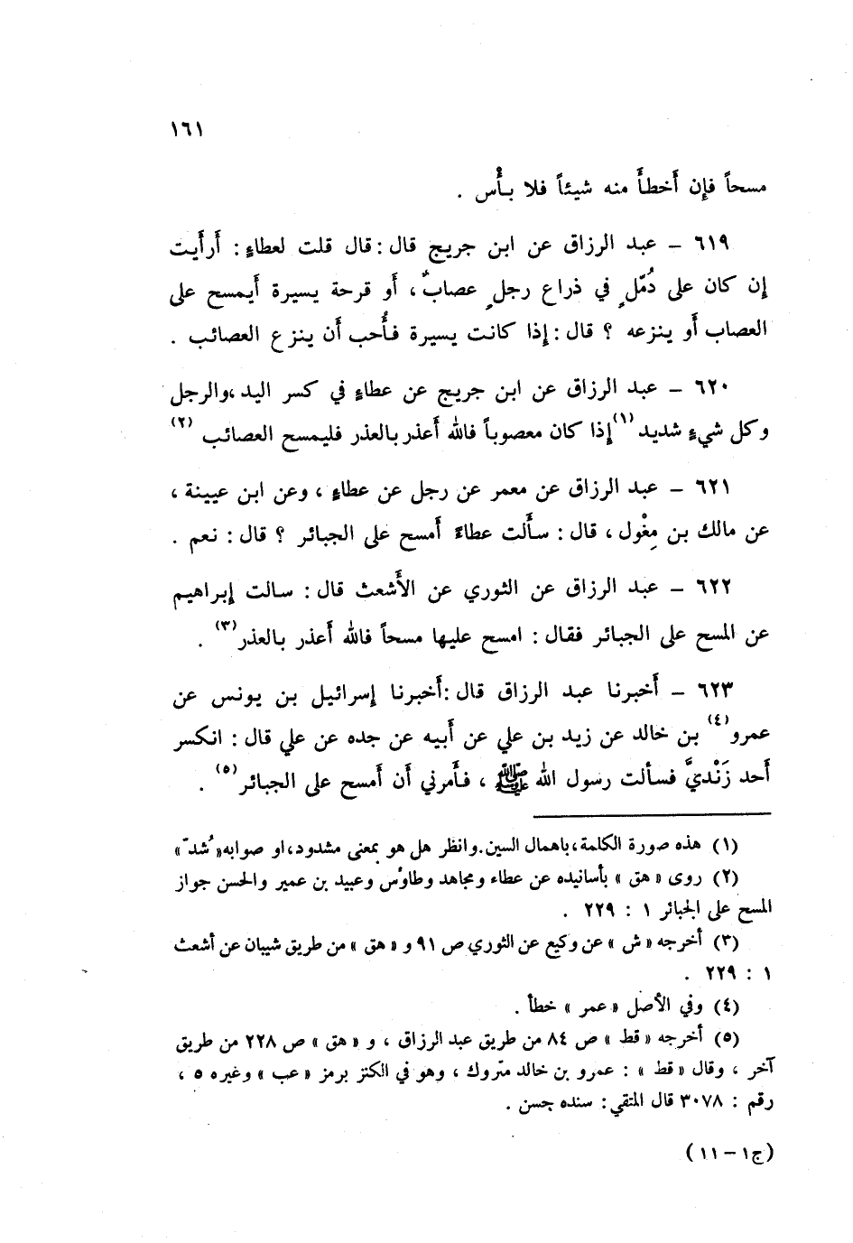 ٦١٩ - عَبْدُ الرَّزَّاقِ، عَنِ ابْنِ جُرَيْجٍ قَالَ: قُلْتُ لِعَطَاءٍ: أَرَأَيْتَ إِنْ كَانَ عَلَى دُمَّلٍ فِي ذِرَاعِ رَجُلٍ عِصَابٌ، أَوْ قُرْحَةٍ يَسِيرَةٍ، أَيَمْسَحُ عَلَى الْعِصَابِ أَوْ يَنْزِعُهُ؟ قَالَ: «إِذَا كَانَتْ يَسِيرَةً فَأُحِبُّ أَنْ يَنْزَعَ الْعَصَائِبَ»