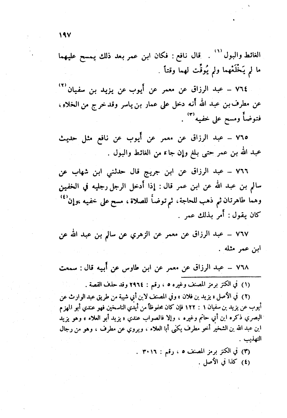 ٧٦٤ - عَبْدُ الرَّزَّاقِ، عَنْ مَعْمَرٍ، عَنْ أَيُّوبَ، عَنْ يَزِيدَ بْنِ سُفْيَانَ، عَنْ مُطَرِّفِ بْنِ عَبْدِ اللَّهِ، أَنَّهُ دَخَلَ عَلَى عَمَّارِ بْنِ يَاسِرٍ «وَقَدْ خَرَجَ مِنَ الْخَلَاءِ فَتَوَضَّأَ وَمَسَحَ عَلَى خُفَّيْهِ».