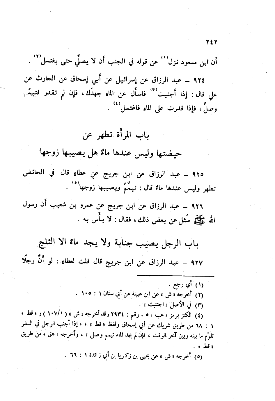 ٩٢٧ - عَبْدُ الرَّزَّاقِ، عَنِ ابْنِ جُرَيْجٍ قَالَ: قُلْتُ لِعَطَاءٍ: لَوْ أَنَّ رَجُلًا احْتَلَمَ فِي أَرْضِ ثَلْجٍ فِي الشَّتَاءِ يَرَى أَنَّهُ إنِ اغْتَسَلَ مَاتَ وَلَا يَقْدِرُ عَلَى أَنْ يُجَهِّزَ لَهُ مَا يَغْتَسِلُ بِهِ أَيَغْتَسِلُ؟ قَالَ: «نَعَمْ، وَإِنْ مَاتَ»، قَالَ اللَّهُ: {وَإِنْ كُنْتُمْ جُنُبًا فَاطَّهَّرُوا} [المائدة: ٦] وَمَا جَعَلَ اللَّهُ لَهُ مِنْ عُذْرٍ