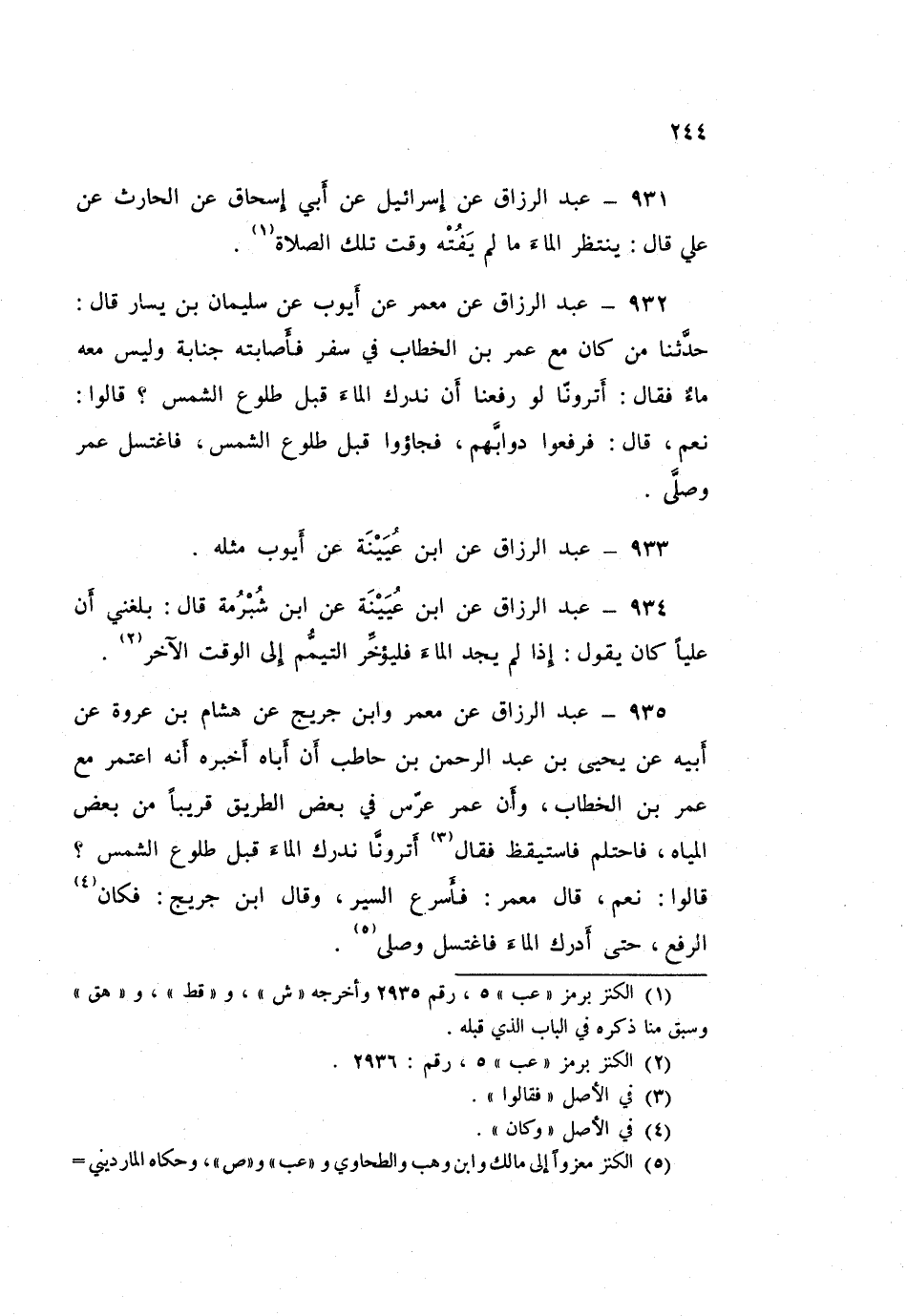 ٩٣٢ - عَبْدُ الرَّزَّاقِ، عَنْ مَعْمَرٍ، عَنْ أَيُّوبَ، عَنْ سُلَيْمَانَ بْنِ يَسَارٍ قَالَ: حَدَّثَنَا مَنْ كَانَ مَعَ عُمَرَ بْنِ الْخَطَّابِ فِي سَفَرٍ فَأَصَابَتْهُ جَنَابَةٌ وَلَيْسَ مَعَهُ مَاءٌ، فَقَالَ: «أَتَرَوْنَا لَوْ رَفَعْنَا أَنْ نُدْرِكَ الْمَاءَ قَبْلَ طُلُوعِ الشَّمْسِ؟» قَالُوا: نَعَمْ قَالَ: فَرَفَعُوا دَوَابَّهُمْ فَجَاءُوا قَبْلَ طُلُوعِ الشَّمْسِ فَاغْتَسَلَ عُمَرُ وَصَلَّى.
