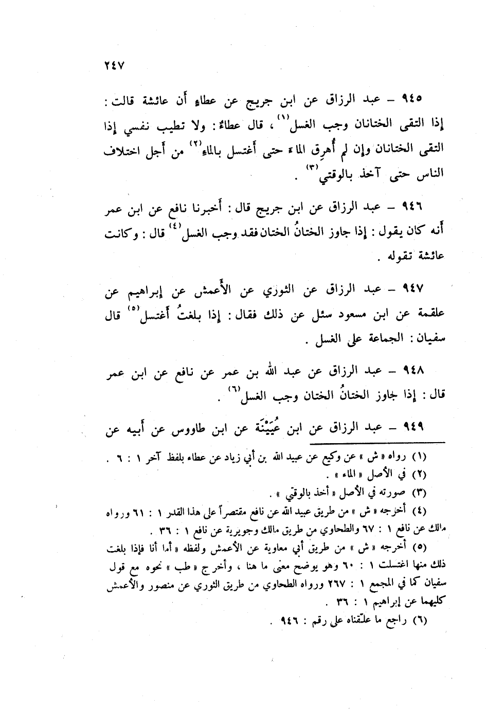 ٩٤٦ - عَبْدُ الرَّزَّاقِ، عَنِ ابْنِ جُرَيْجٍ قَالَ: أَخْبَرَنَا نَافِعٌ، عَنِ ابْنِ عُمَرَ، أَنَّهُ كَانَ يَقُولُ: «إِذَا جَاوَزَ الْخِتَانُ الْخِتَانَ فَقَدْ وَجَبَ الْغُسْلُ» قَالَ: وَكَانَتْ عَائِشَةُ تَقُولُهُ