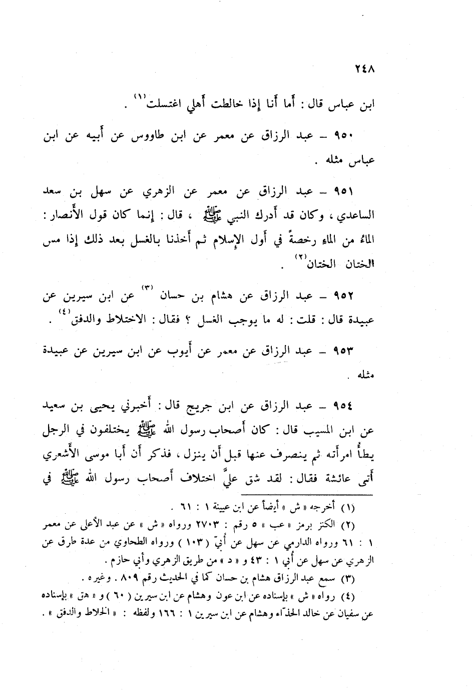 ٩٥٢ - عَبْدُ الرَّزَّاقِ، عَنْ هِشَامِ بْنِ حَسَّانَ، عَنِ ابْنِ سِيرِينَ، عَنْ عَبِيدَةَ قَالَ: قُلْتُ لَهُ: مَا يُوجِبُ الْغُسْلَ؟ فَقَالَ: «الِاخْتِلَاطُ، وَالدَّفْقُ».