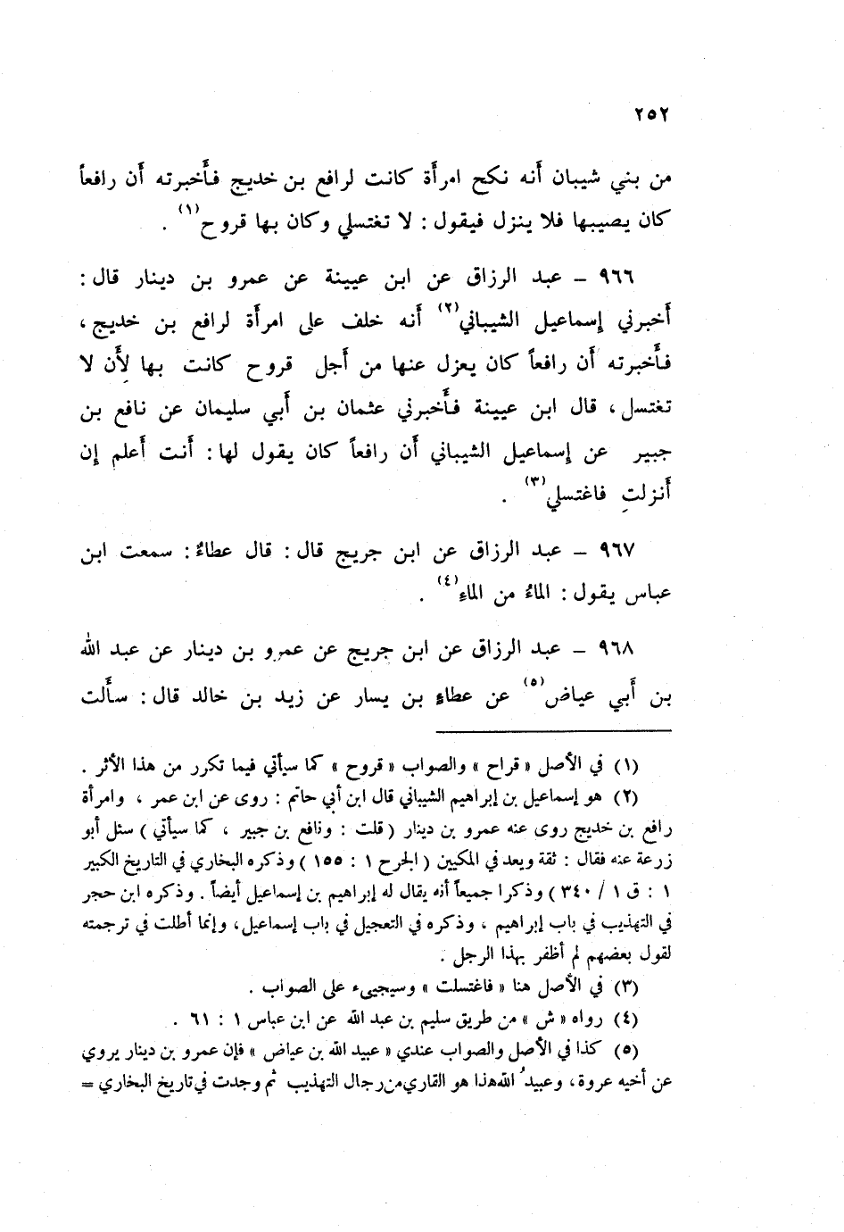 ٩٦٦ - عَبْدُ الرَّزَّاقِ، عَنِ ابْنِ عُيَيْنَةَ، عَنْ عَمْرِو بْنِ دِينَارٍ قَالَ: أَخْبَرَنِي إِسْمَاعِيلُ الشَّيْبَانِيُّ، أَنَّهُ خَلَفَ عَلَى امْرَأَةٍ لِرَافِعِ بْنِ خَدِيجٍ فَأَخْبَرَتْهُ أَنَّ رَافِعًا كَانَ يَعْزِلُ عَنْهَا مِنْ أَجْلِ قُرُوحٍ كَانَتْ بِهَا، لِأَنْ لَا تَغْتَسِلَ "